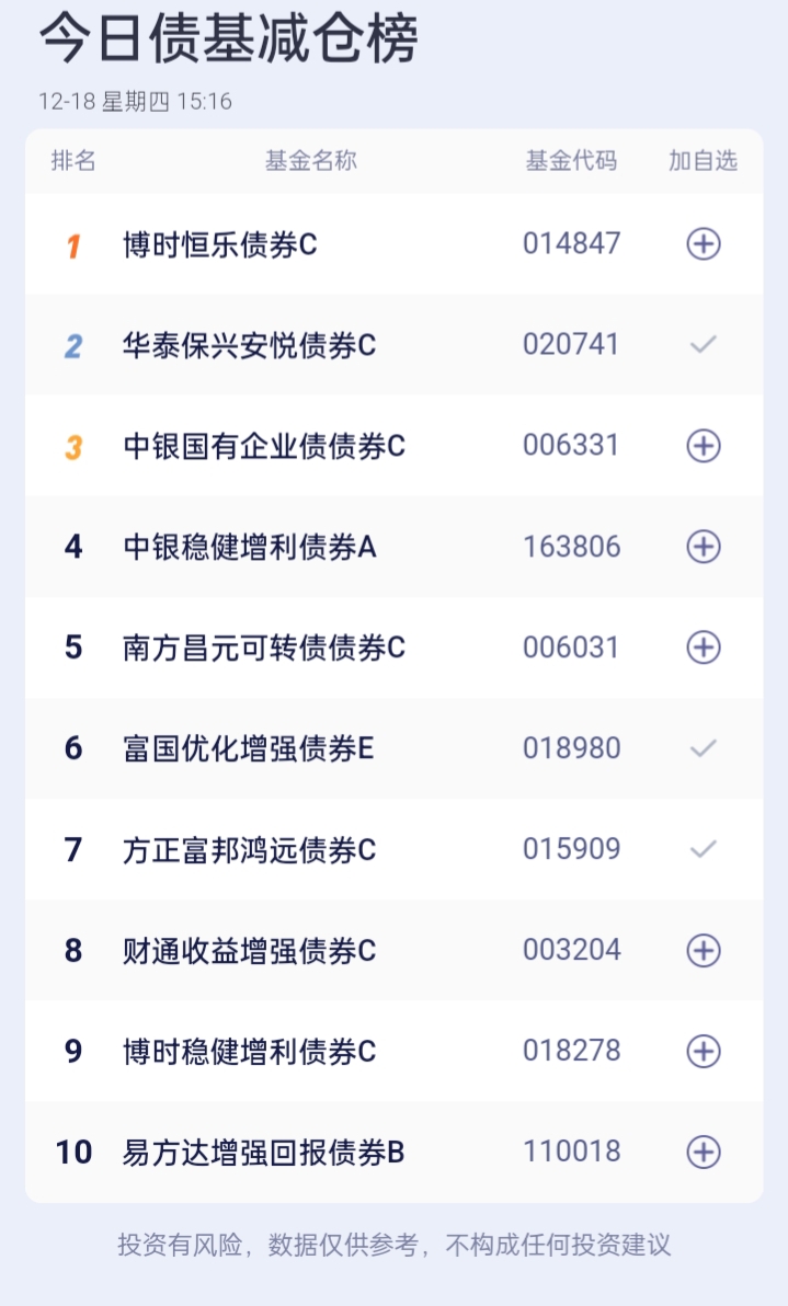 八、债券基金加、减仓榜(截止到15:00收盘)