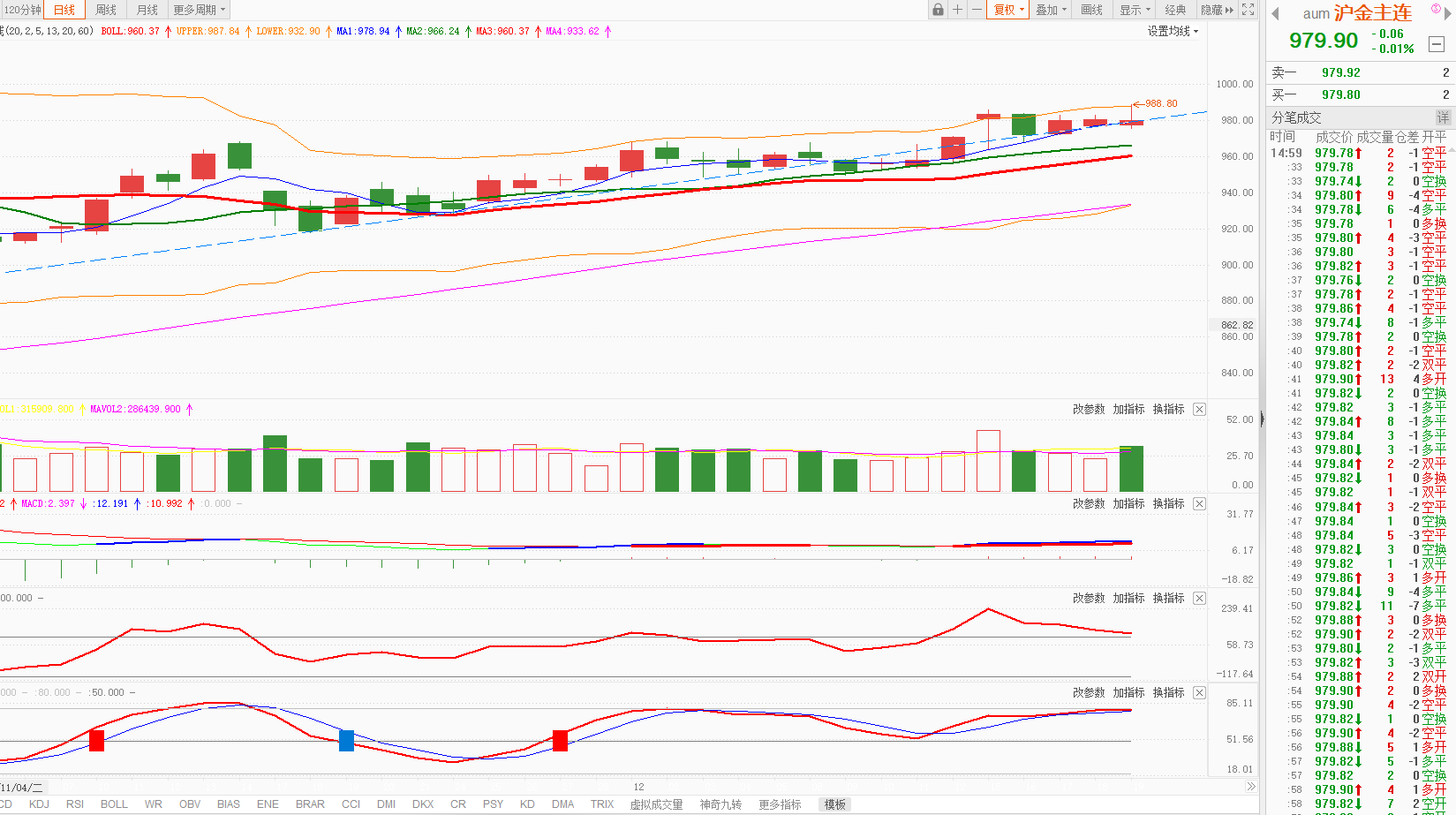 沪金主连:跌0.01%,日K线在5日均线之上。今天沪金微跌,盘中冲高回落,目前仍处于强势整理状态,国际金价昨晚创历史新高,目前支撑黄金的逻辑仍在,震荡后可能会继续上行,可持仓观望或采用适量仓位高抛低吸,降低持有成本。