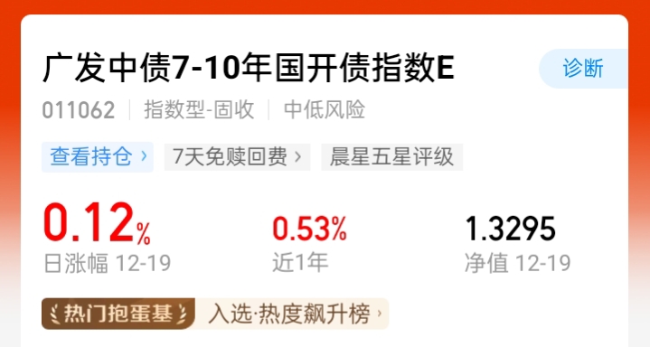今天广发中债7-10收12蛋,近1周收20蛋,近3月收77蛋,排名同类前2%!广发7-10年为老牌绩优利率债基,主投国开债,进攻性强。上市以来21个季度荣获晨星5星评级,连续7年实现正收益,能涨抗跌,调整后修复速度快,净值屡创新高。近1年涨幅达0.53.%。业绩锐度是7-10年里面最高的,热度和业绩都很好!
