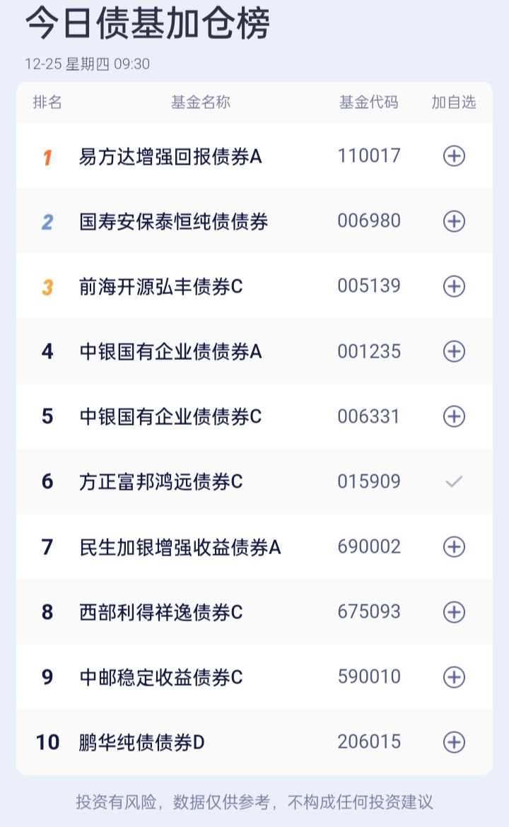 $华泰保兴安悦债券C(OTCFUND|020741)$。$永赢稳健增强债券C(OTCFUND|014089)$。$易方达增强回报债券A(OTCFUND|110017)$。$方正富邦鸿远债券C(OTCFUND|015909)$。$东方添益债券(OTCFUND|400030)$。$华泰保兴安悦债券A(OTCFUND|007540)$。$长城短债C(OTCFUND|007195)$。$博时恒乐债券C(OTCFUND|014847)$。$广发中债7-10年国开债指数E(OTCFUND|011062)$。$鹏华丰禄债券(OTCFUND|003547)$