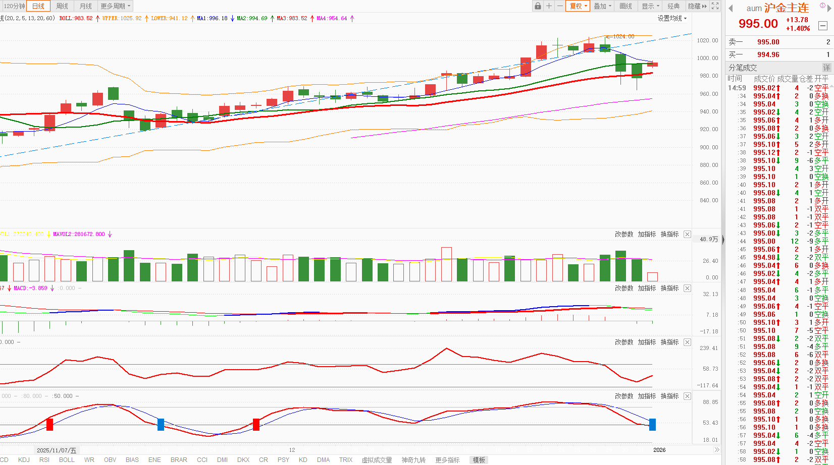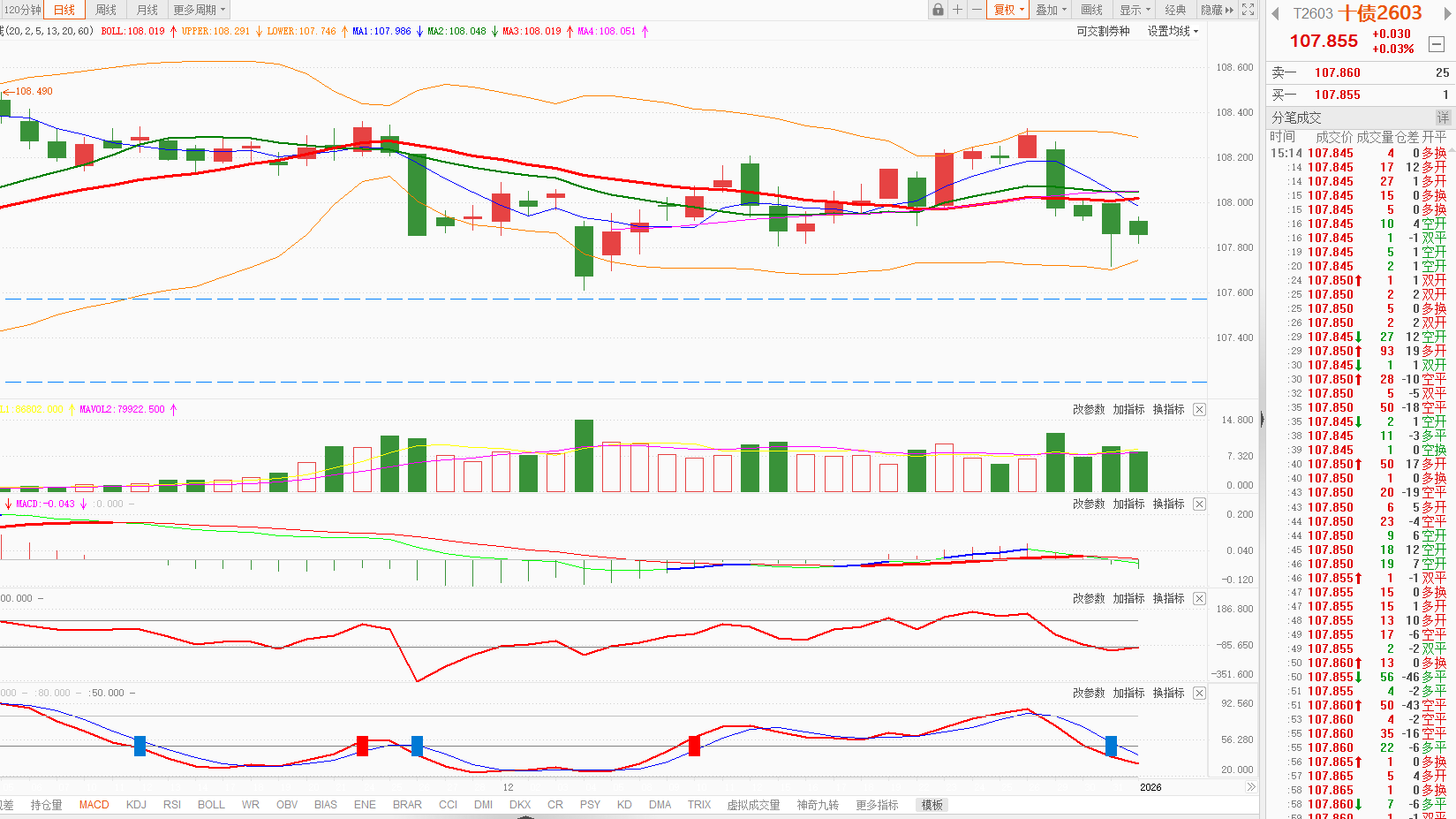 今天国债期货日K线收盘后全部在5日均线之下,整体走势较弱。