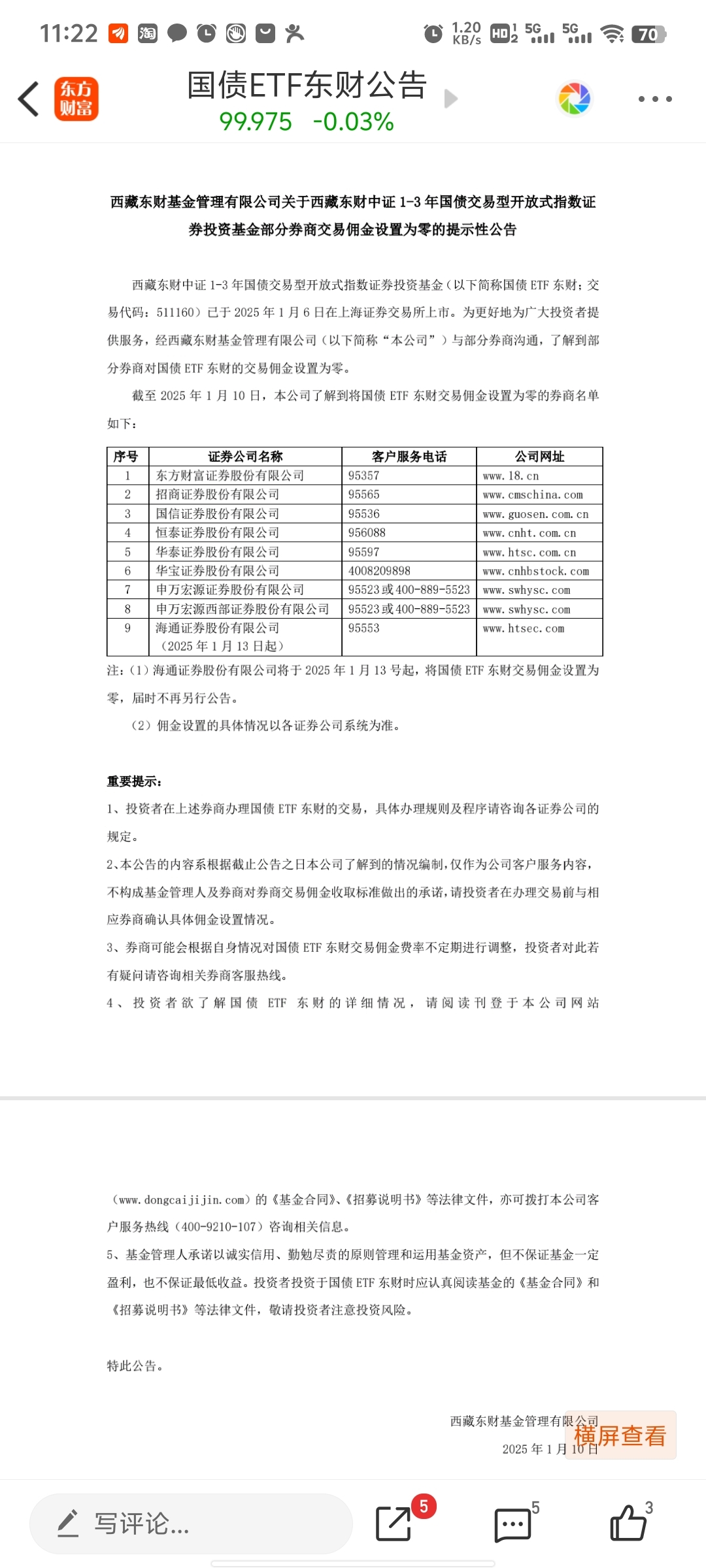 $国债ETF东财(SH511160)$ 99.973买的,成本99.978,不是说零佣金吗?我亲测一手需要2.5元的交易成本。