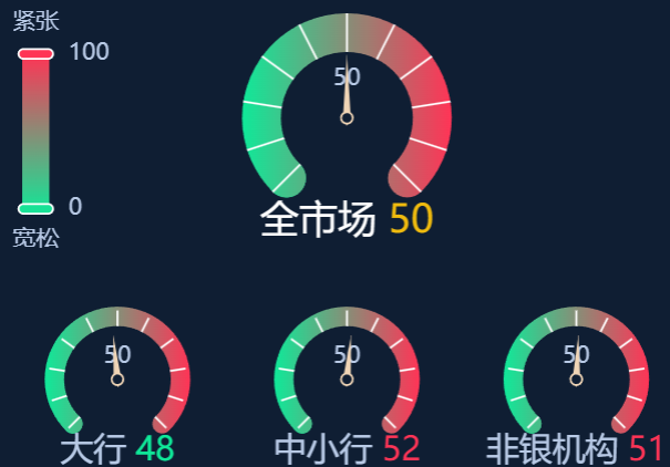 六、资金面情绪指数:全市场50 资金面紧平衡(0-100紧张度递增,50为均衡,超过50反映资金紧张)