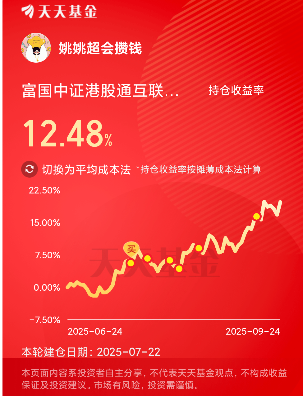 姚姚前期逢低加仓和分享的富国港股通互联网,持仓到现在,收益率已经有12.48%了!