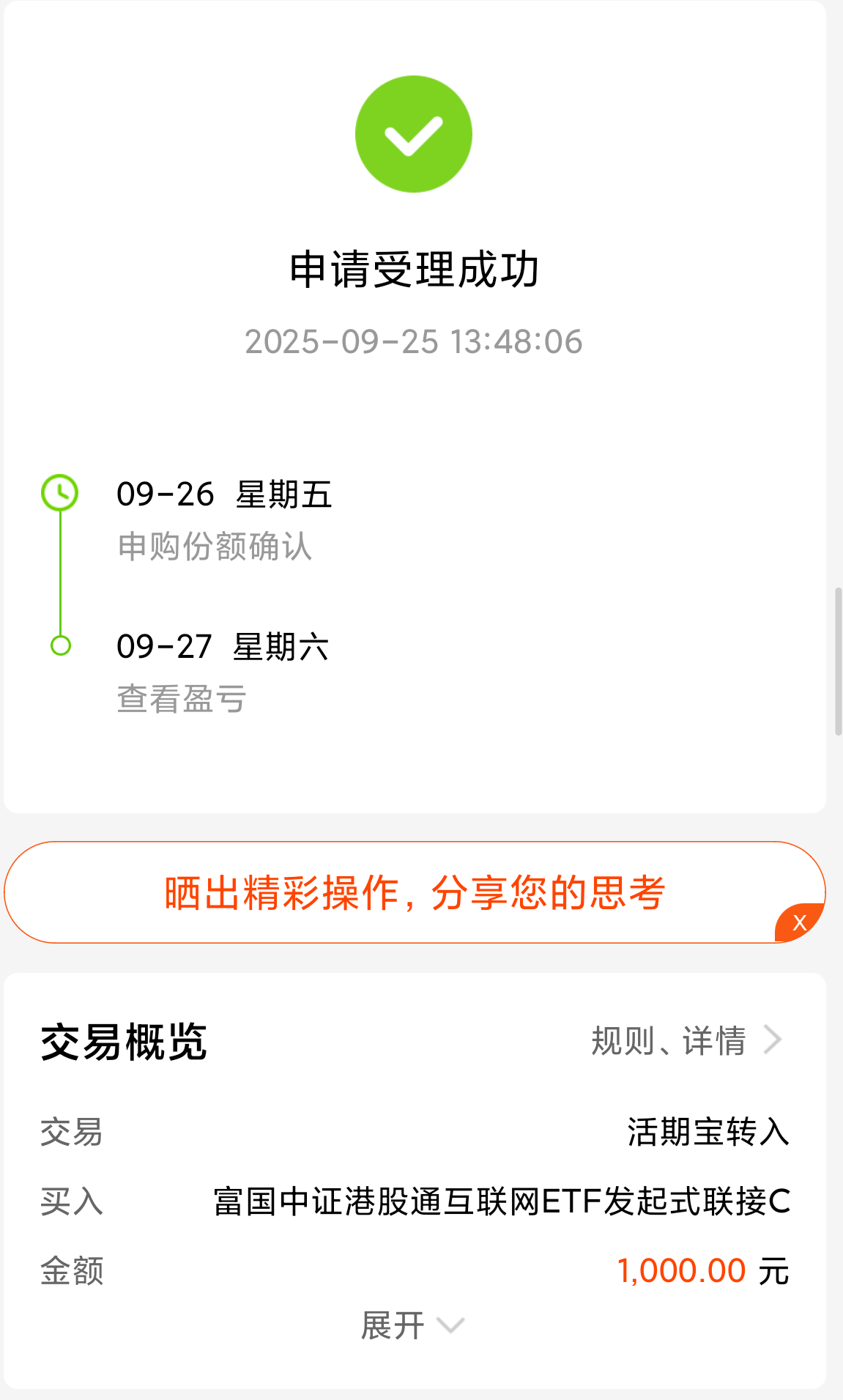 今天姚姚顺势而为继续加仓1000元$富国中证港股通互联网ETF发起式联接C(OTCFUND|014674)$昨天大涨近2.5%,今天上涨接近1%,趋势已经走出来了,技术面转强。最近阿里巴巴动作很频繁先是宣布推进3800亿的AI基础设施建设并计划追加更大的投入,昨天又阿里巴巴也宣布了与英伟达开展Physical AI合作,咱就是说年初至今,以DeepSeek为代表的国内科技企业创新不断,开启科技牛市行情,AI浪潮必然不会缺席!港股通科技对港股互联网龙头实现了全覆盖,都是国内顶级大厂龙头,而且又在降息周期内,港股通科技也相比于恒生科技来说科技纯度更高,安全边际高,未来收益确定性也高,行情好的时候顺势才是王道!
