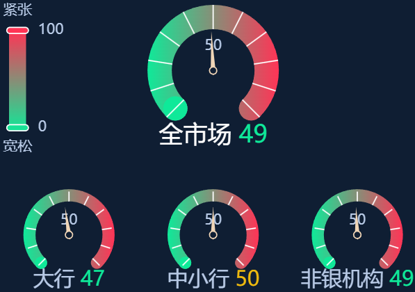 六、资金面情绪指数:全市场49 资金面维稳 (0-100紧张度递增,50为均衡,超过50反映资金紧张)
