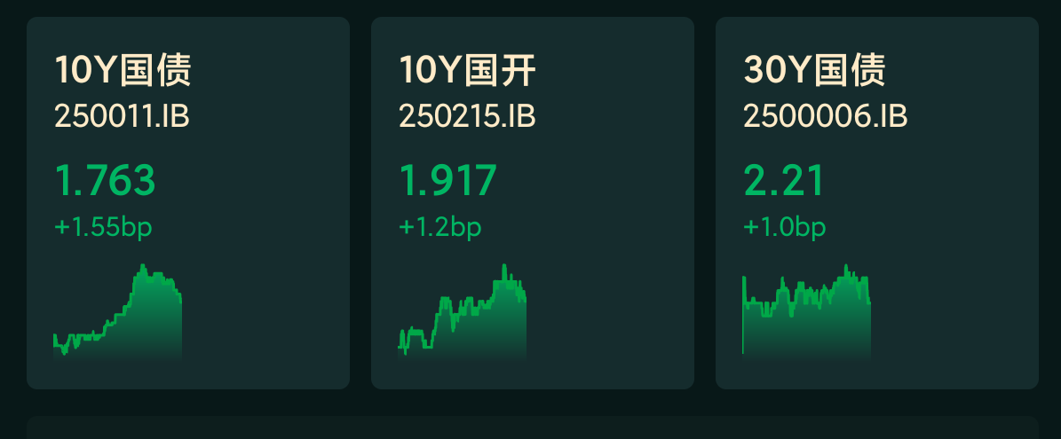 十年期国债收益率:1.763%,+1.55BP(国债收益率越跌,债市越涨)
