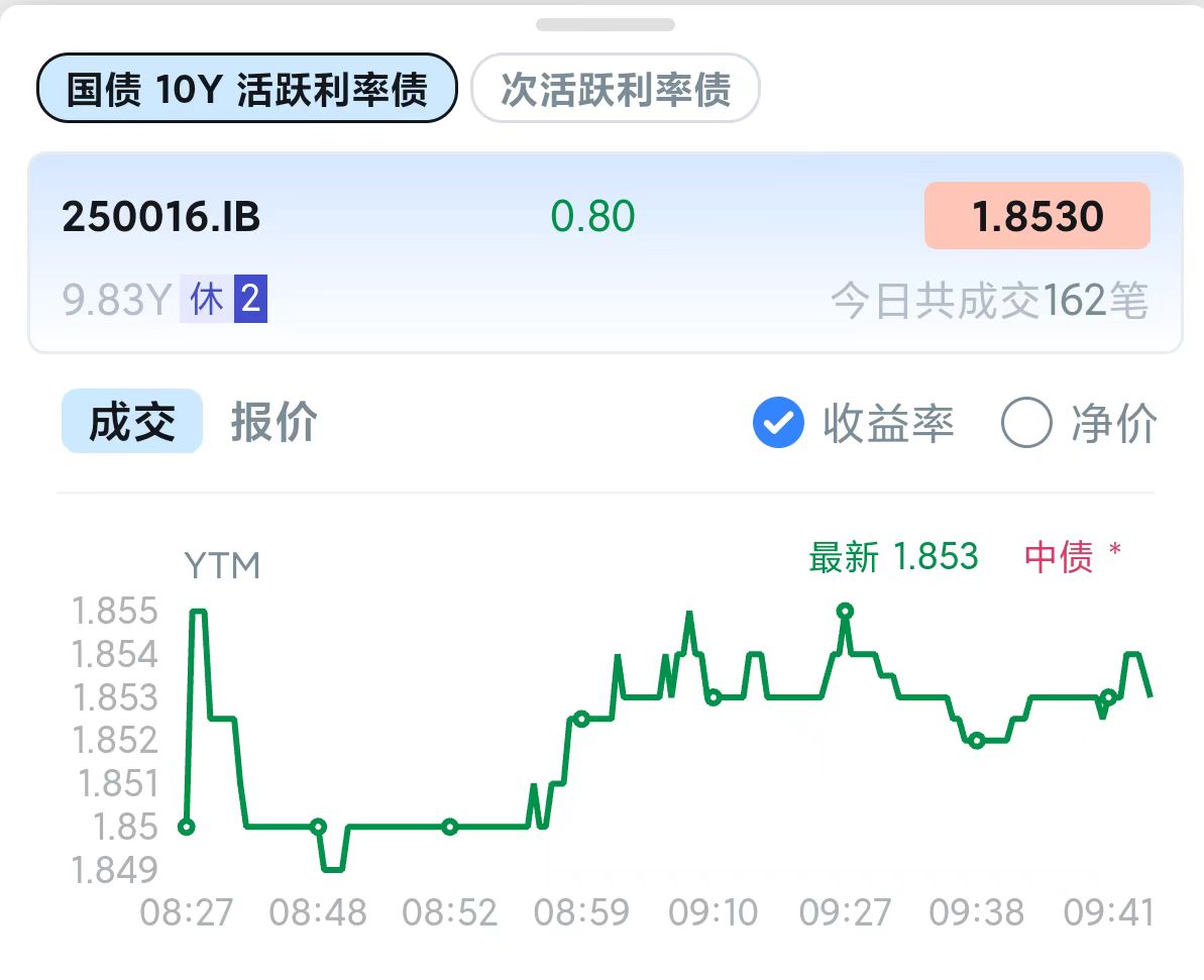 十年期国债收益率:1.853%,+0.8BP(国债收益率越跌,债市越涨)