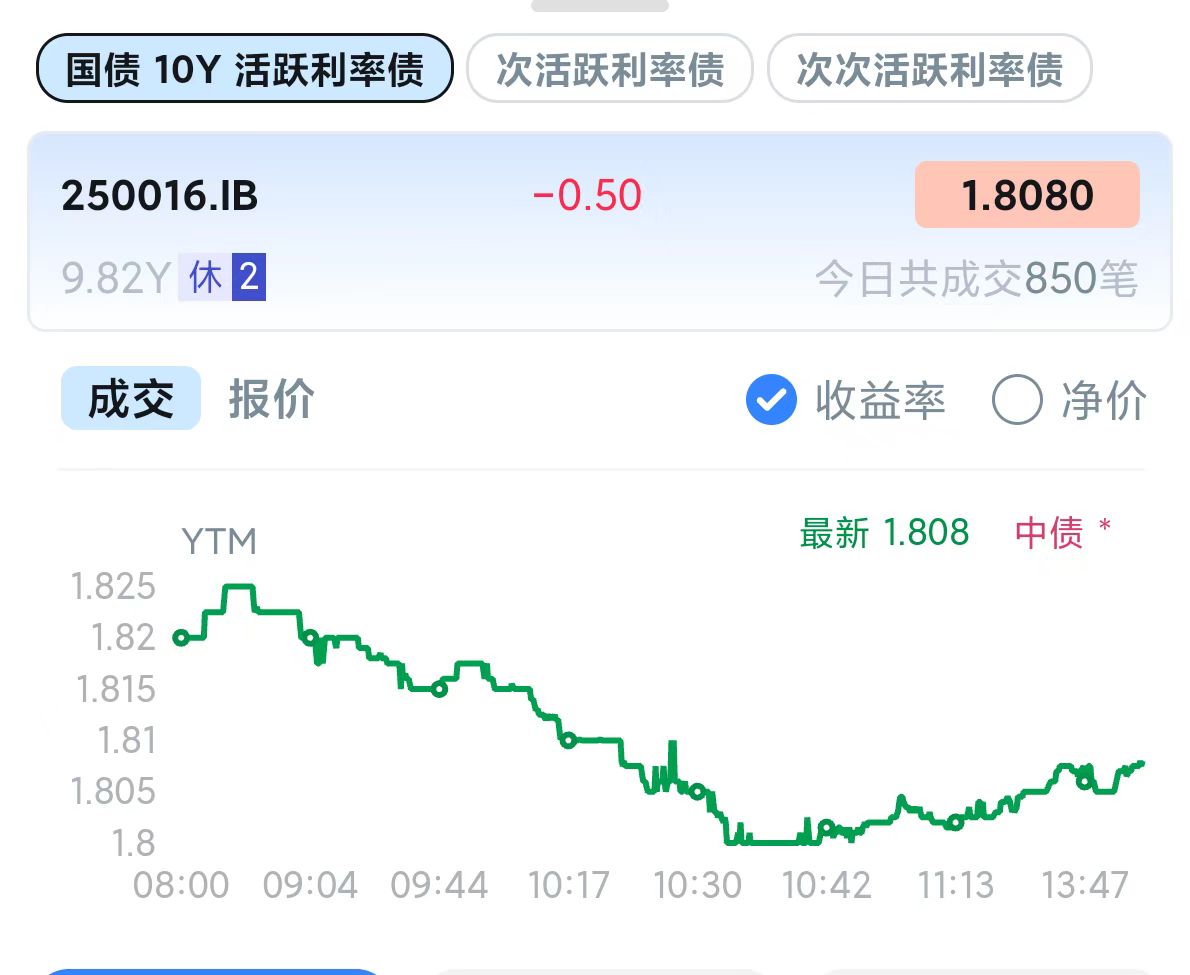 十年期国债收益率:1.808%,-0.5BP(国债收益率越跌,债市越涨)