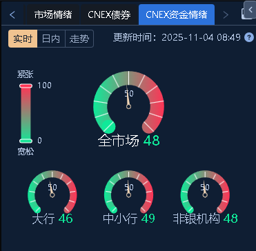 DR001报1.30%左右,DR007报1.40%左右,资金情绪均衡偏松(CNEX资金面情绪指数在48)