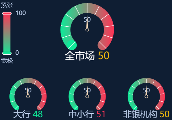 六、资金面情绪指数:全市场50 资金面紧平衡 (0-100紧张度递增,50为均衡,超过50反映资金紧张)