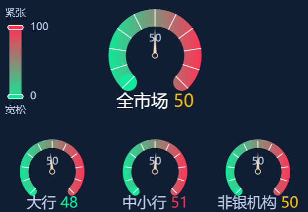 五、资金面情绪指数:全市场50 资金面紧平衡 (0-100紧张度递增,50为均衡,超过50反映资金紧张)