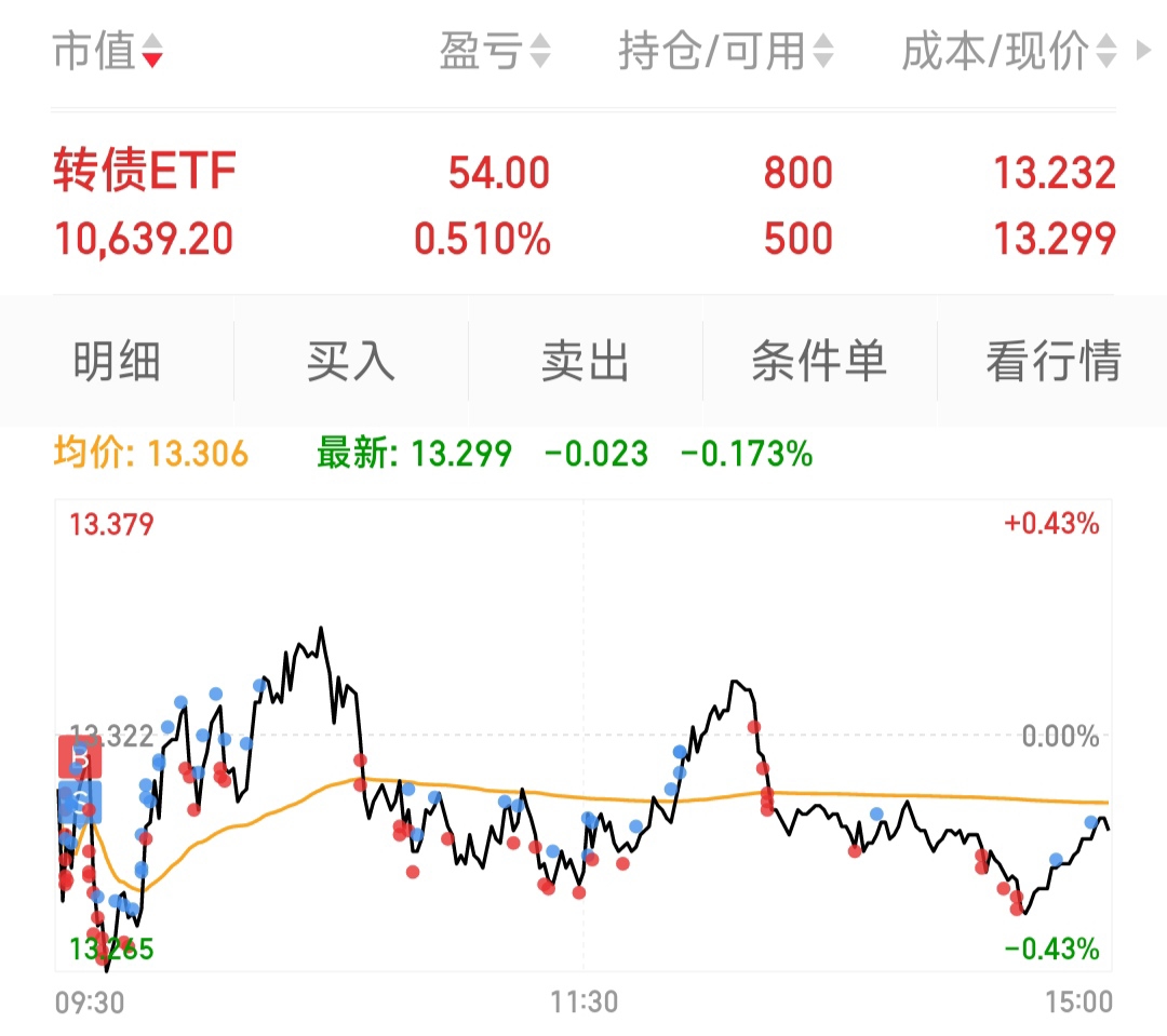 昨天因为可转债与上证转债上涨,赢利清仓。今天两个ETF下跌,条件单自动重启低买高