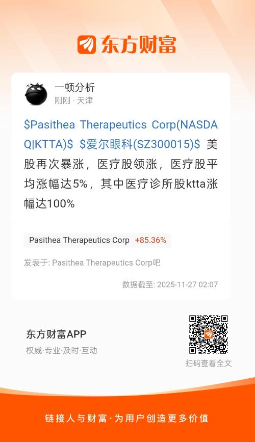 $Pasithea Therapeutics Corp(NASDAQ|KTTA)$ $爱尔眼科(SZ300015)$ 美股再次暴涨,医疗股领涨,医疗股平均涨幅达5%,其中医疗诊所股ktta涨幅达100%