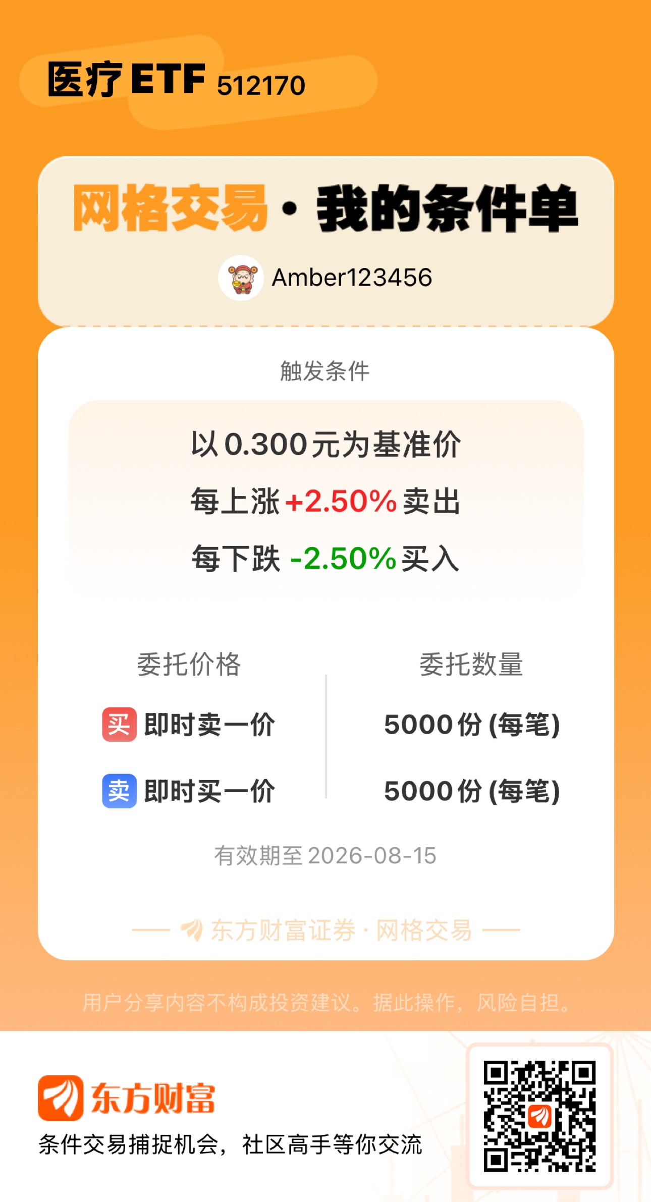 #条件单交流# #网格交易晒单# 一位股神设置了一个网格交易条件单,接下来就是见证奇迹的时刻~$医疗ETF(SH512170)$