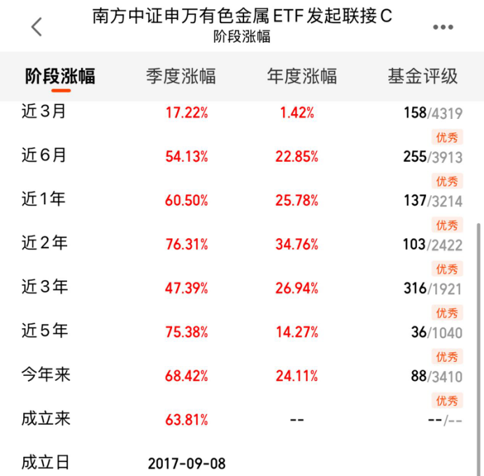 不过话说回来,普通投资者真想从有色板块赚钱,直接买个股确实有点难。这个产业链太长了,从矿山挖矿石,到工厂冶炼,再到下游加工,每个环节的逻辑都不一样。比如铜矿开采,就有硫化物、氧化物、聚合物三条技术路线,随便拎出来一条都够研究半天。加上最近价格波动大,有时候一天就能涨跌好几个点,个股踩雷的风险确实不低。这种时候,借道指数基金分散风险可能是更省心的选择。比如南方基金的南方中证申万有色金属ETF发起联接C(004433),这只基金把铜、铝、锂、稀土等全产业链的龙头企业都包进去了,相当于一键布局整个板块,不用自己费心挑个股。业绩最能说明问题,最近三个月它涨了17.22%,半年涨了54.13%,一年下来涨幅超过60%,成立到现在总收益也有63.81%,这个成绩在同类基金里算是相当能打的。 $南方中证申万有色金属ETF发起联接C(OTCFUND|004433)$、$南方中证申万有色金属ETF发起联接A(OTCFUND|004432)$