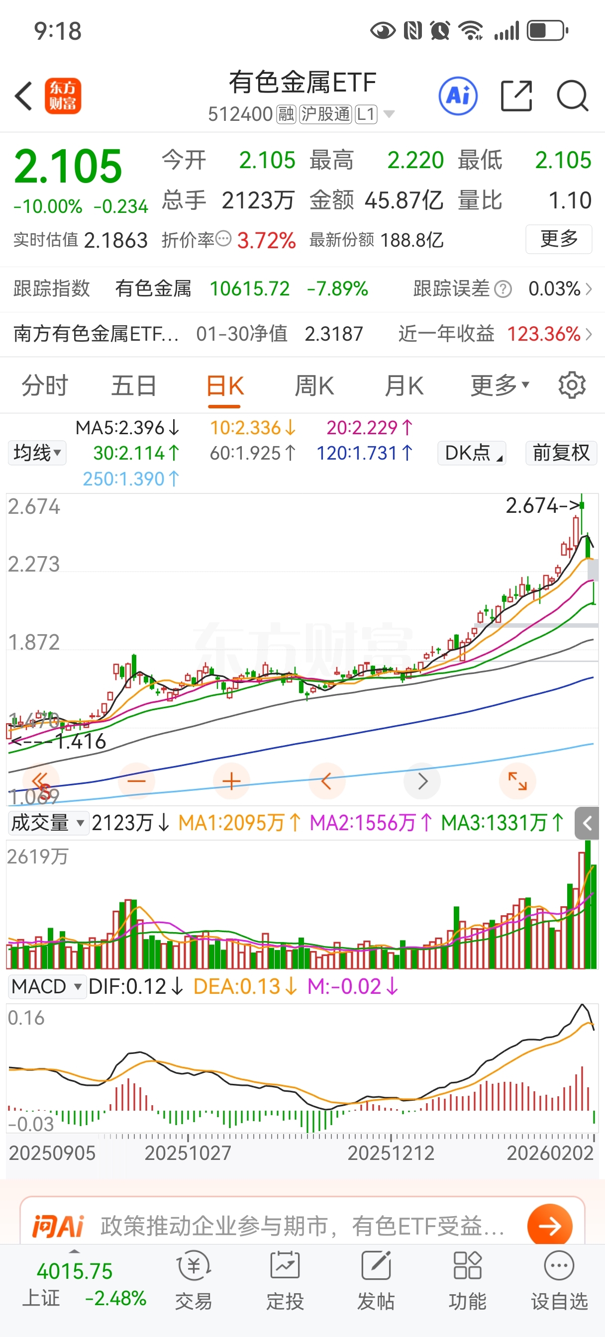 $有色金属ETF(SH512400)$ 折价3.7%,明天要抢了