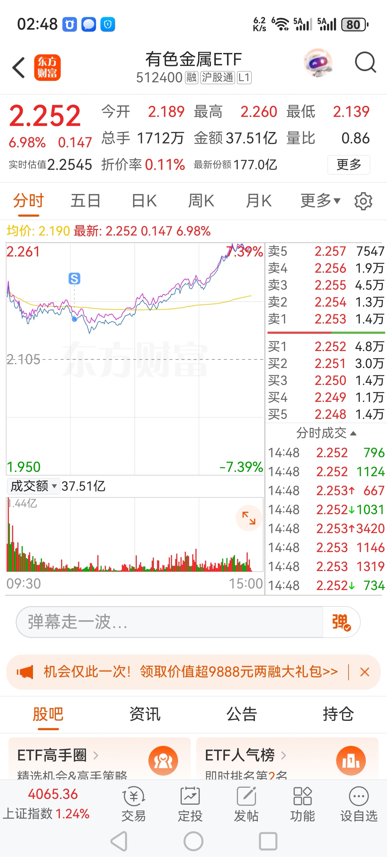 $有色金属ETF(SH512400)$ 出了三分之一仓,抄底西部黄金,还好涨了,不然真