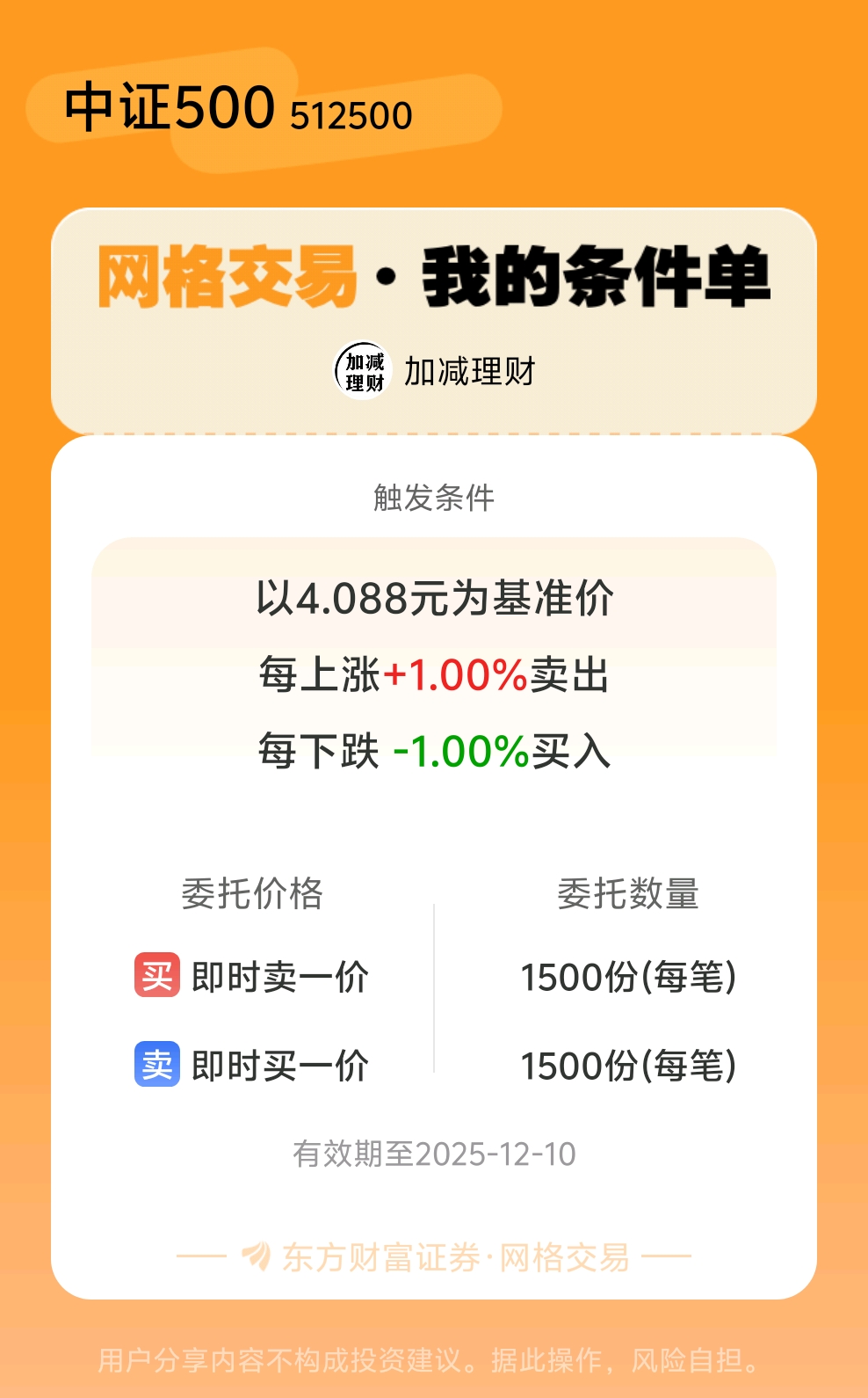 #条件单交流# #网格交易晒单# 一位股神设置了一个网格交易条件单,接下来就是见证奇迹的时刻~$中证500(SH512500)$
