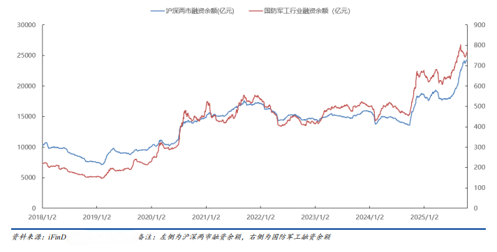 从资金面观察,国防军工行业的融资余额变化印证了产业景气度的提升。自2018年以来,沪深两市融资余额与国防军工行业融资余额总体呈现上升趋势,均在2021年末达到相对高点;2022年起表现出波动性加剧的特性。2024年10月8日至今呈现明显上涨趋势,截至2025年10月16日,国防军工行业(申万)融资余额合计769.24亿元,占两市融资余额3.2%,资金配置意愿持续增强。