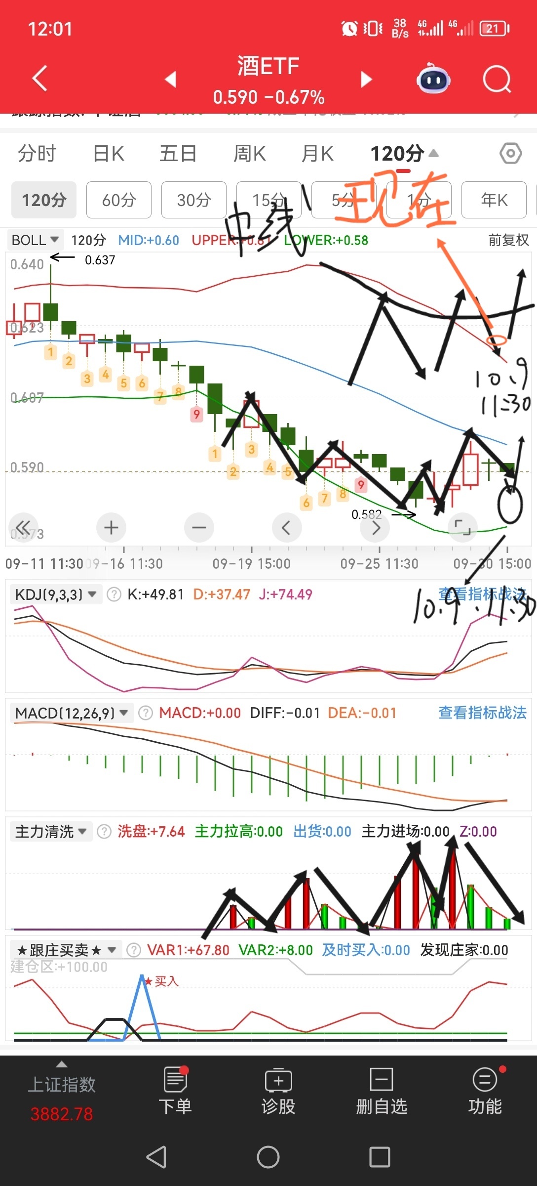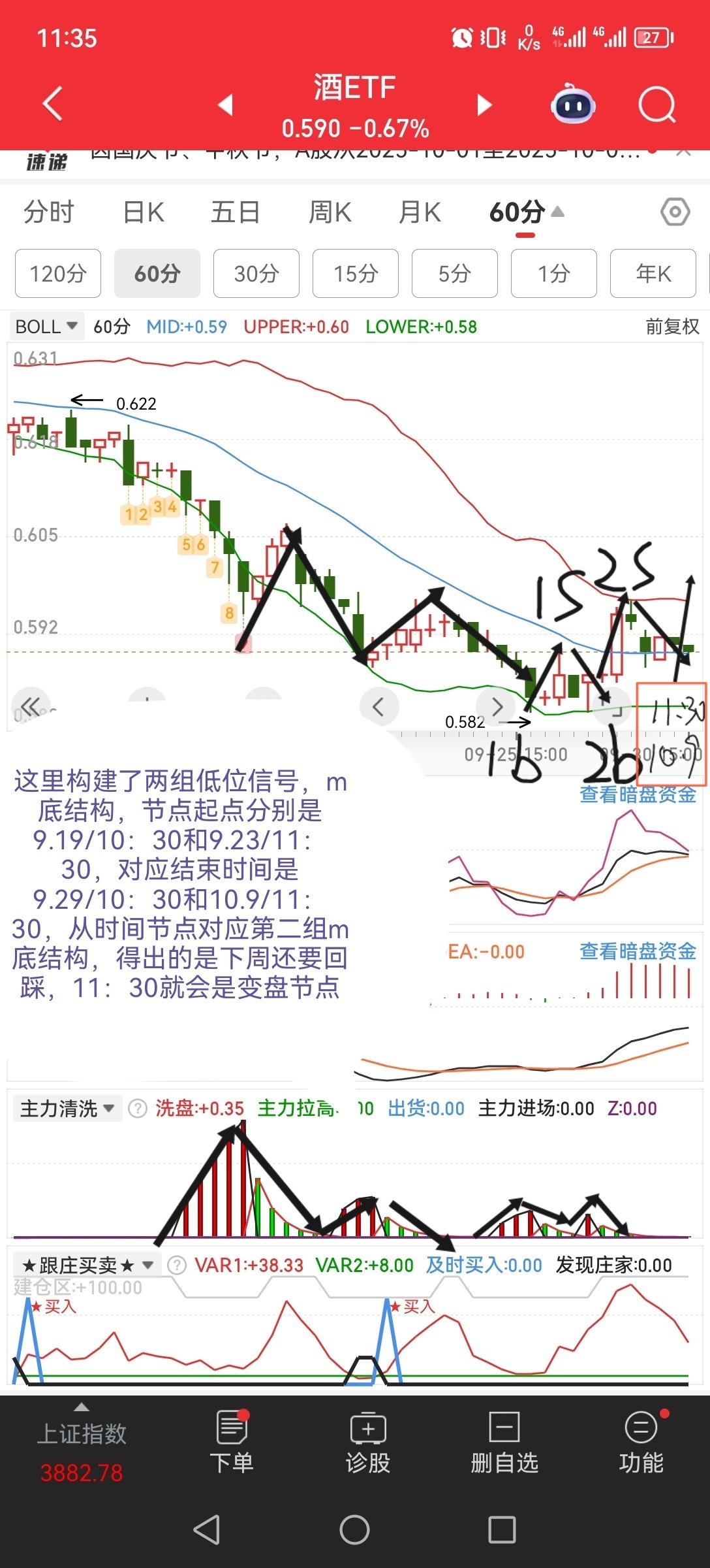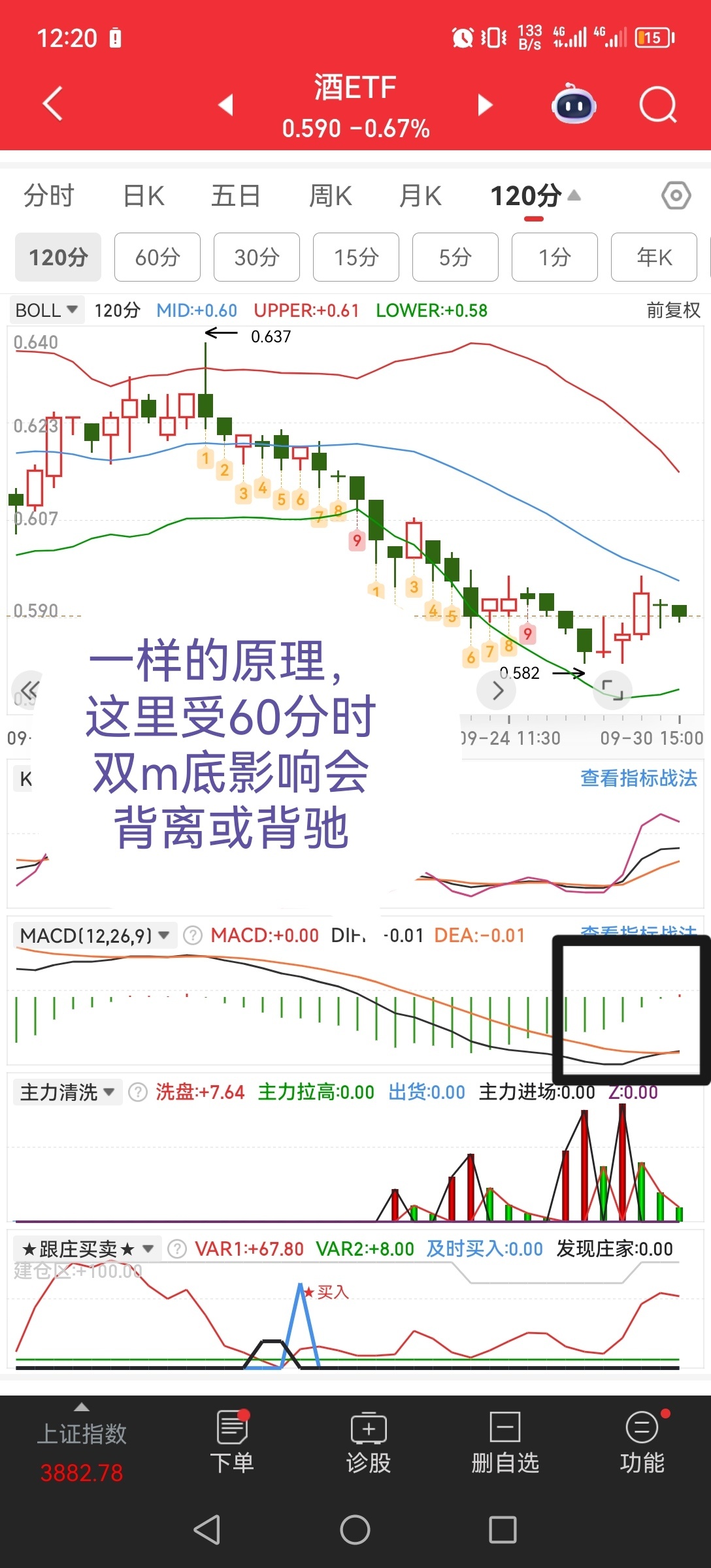 10.14/10:30和10.15/10:30这一组属于对称图形,对标60分时图第一个m底的结构的对称图形,这样说云里雾里的,可以这么理解10.14/10.15各种会出现60分时新高和前面9.19/9.23成为一组低转高的对称图形,120分时也在构建,不过那个分时结构是12天的有些远