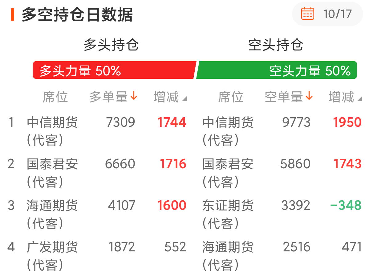 从最新11月期的期指数据来看,中信席位的多头资金增持了多单1744手,空头资金增持了多单1950手,对冲之后空头还是净增状态,短期还有压力。