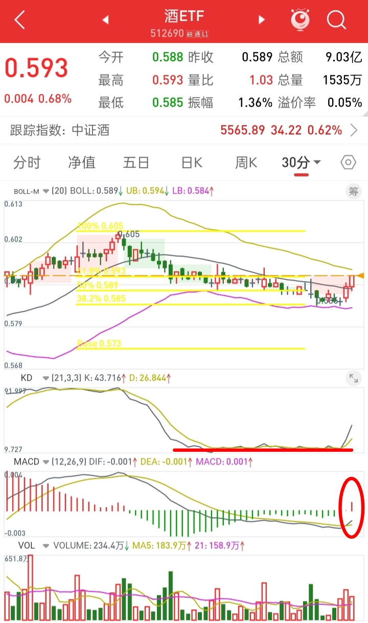 昨天打气别割肉三十分钟图KD指标在地上摩擦就等MACD红柱子了