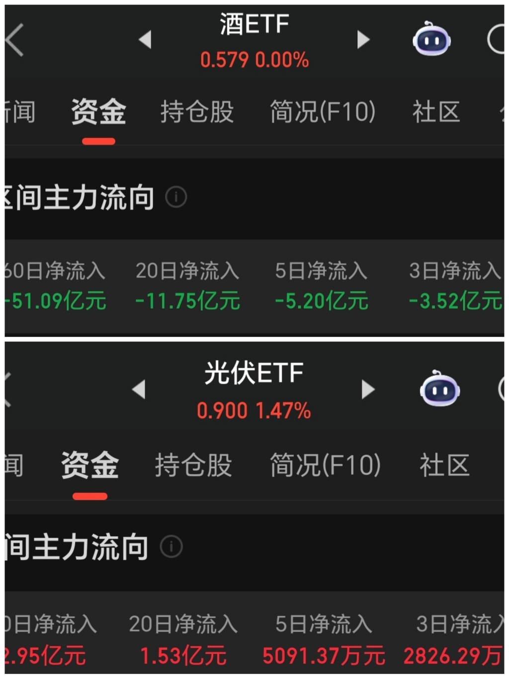 $酒ETF(SH512690)$ 没有资金关注的票还是少碰,那些资金流进/流出肯定有他的原因。想拿个几年扛的住亏损的现在可以买点底仓,千万别满仓心态就会好点,迟早有一天风水会轮流转,想短期内大涨白酒是不可能的,至少主力资金都在流出。以下图谨做参考!