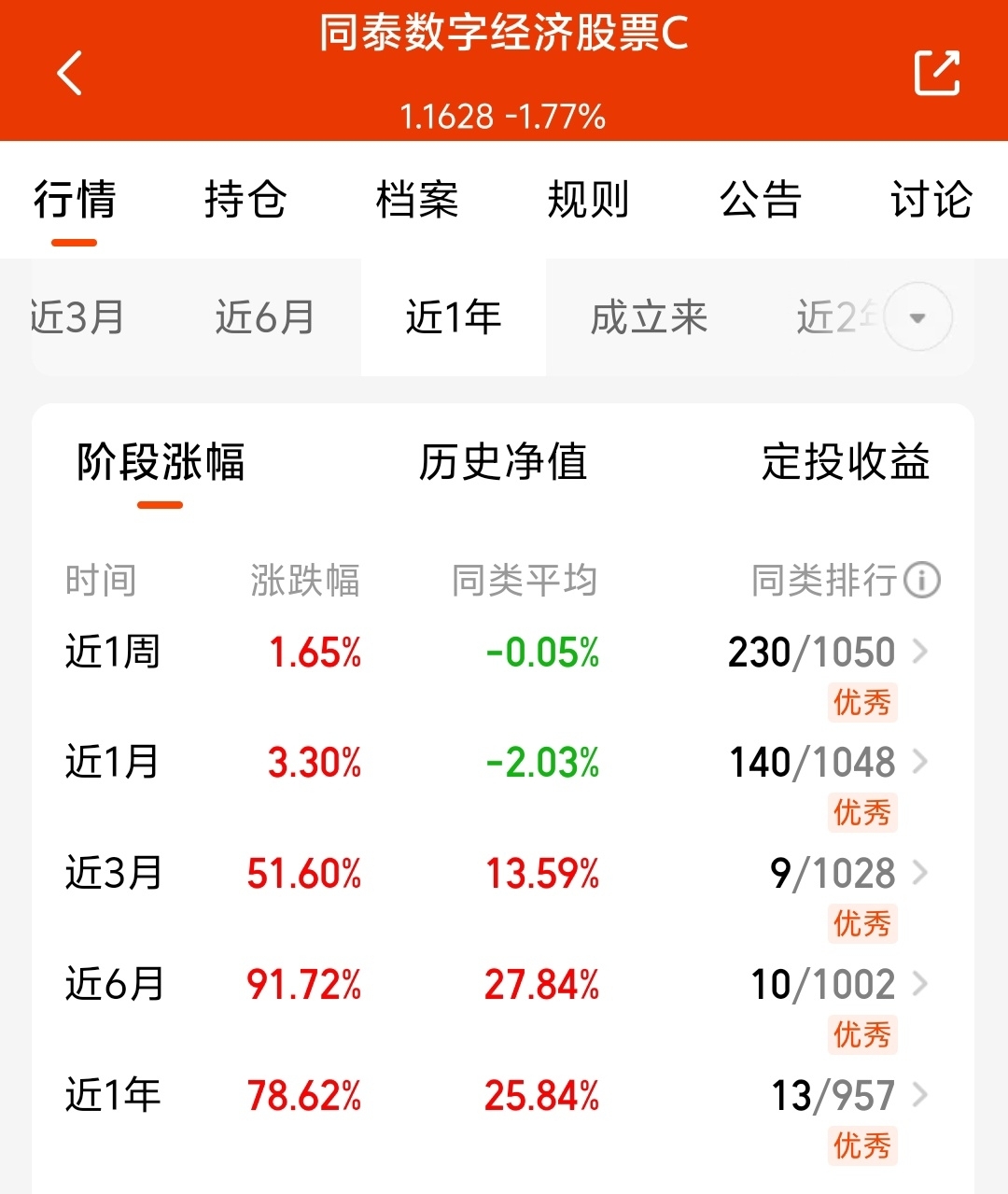 同泰数字经济C,科技投资新势力!近一年收益率78.62%,排名前1%的科技基金。