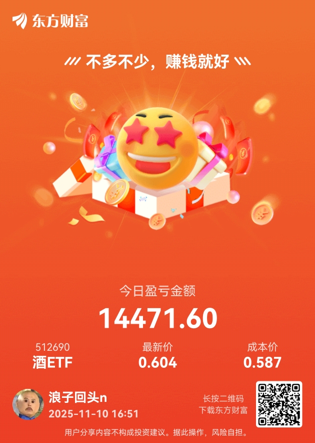 $酒ETF(SH512690)$ 明天别涨了大哥,我就一底仓在里面没必要,空头大哥明天给点力使劲砸让我低位补补仓