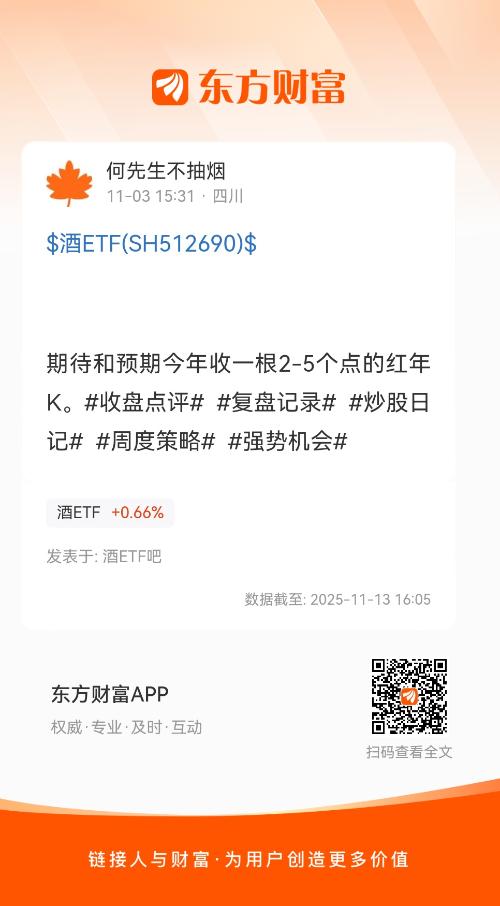 年线还负1.5%,未来两个月,年线红2-5%应该很保守,也很轻松。大钱都是底部熬出来的,924大仓位创业板50,翻倍后转战消费,期待未来1-2年的机会,预期不高,9毛就行,50个点收益就满足了。$酒ETF(SH512690)$