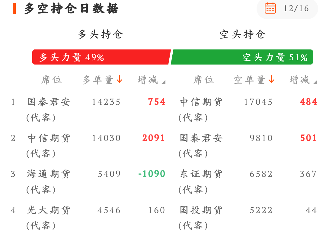 从12月期的沪深300期指数据来看,短期中信席位的多头资金加仓增持了多单2091手,空头资金加仓增持了空单484手,对冲之后多头增持进场,短期压力降低。