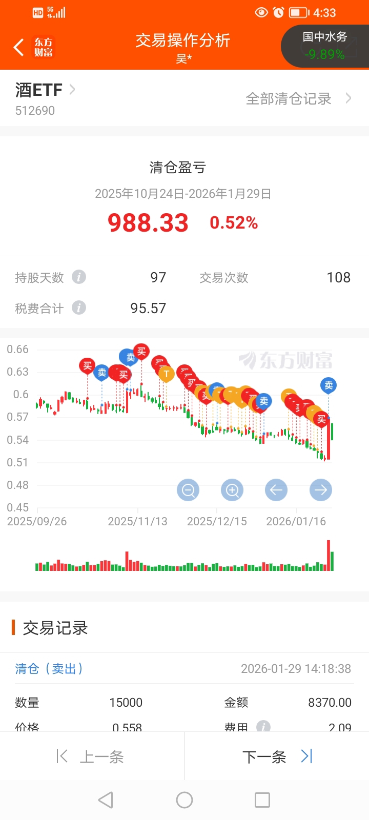 $酒ETF(SH512690)$ 昨天确实卖飞了均价0.549,如果卖的好可以多赚1000块,可今天一看还算幸运