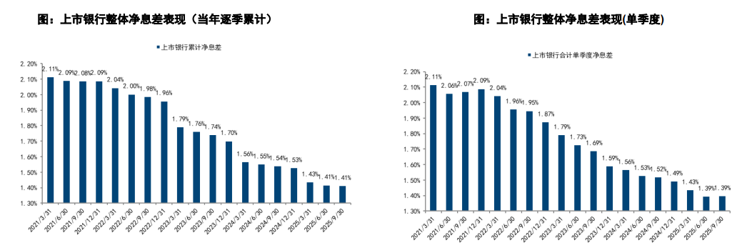 2025年三季报显示,银行业净息差环比企稳已形成全行业共性特征。今年前三季度上市银行整体净息差同比下降13bps至1.41%,较2024年17bps的降幅略有收窄。从单季度净息差环比来看,三季度环比二季度持平,我们认为应当主要是受益于存款重定价带来的负债成本改善。
