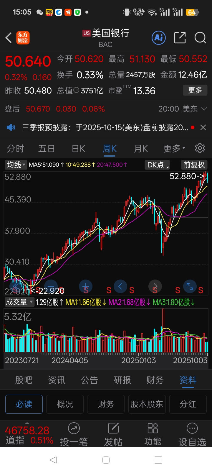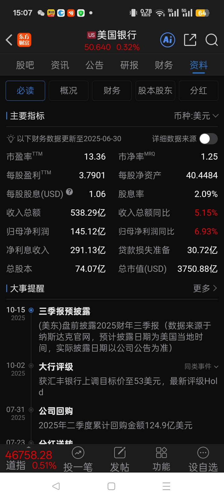美国银行估值比中国A股银行股估值更是高得多,2026年10月3日最新收盘市盈率ttm达13.36,市净率达1.25,股息率才2.09%,股价也是与大盘指数同步持续上涨,并没有与美股大盘指数形成跷跷板效应。