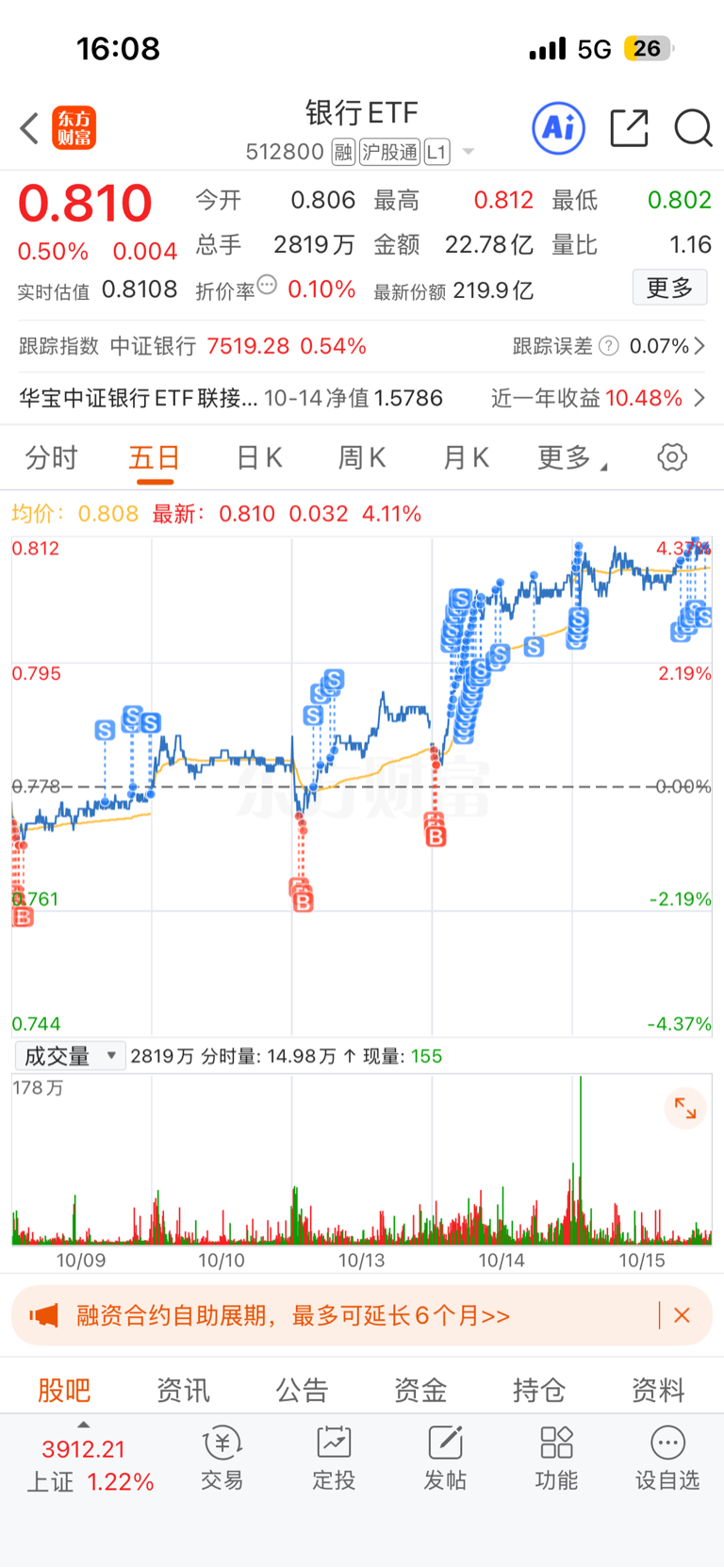 定投28天银行ETF整体成本持有(约3.8%)利润,从日常做T到10.14开始止盈减仓(减仓35%),10.15早盘减仓20%,午后减仓20%目前仓位在25%左右,轻仓位继续持有!