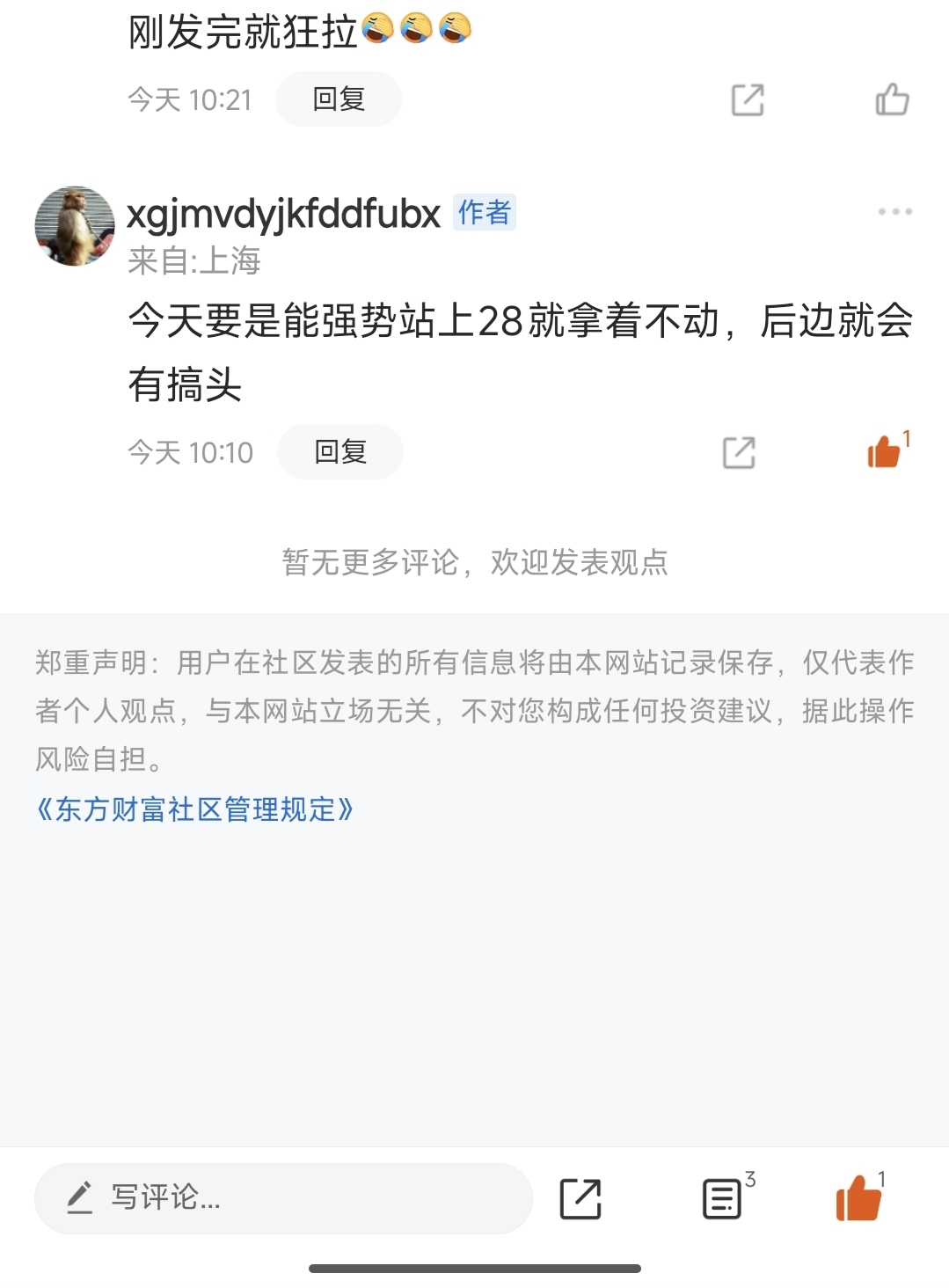温馨提示: 1.根据《证券法》规定,禁止编造、传播虚假信息或者误导性信息,扰乱证券市场;2.用户在本社区发表的所有资料、言论等仅代表个人观点,与本网站立场无关,不对您构成任何投资建议。用户应基于自己的独立判断,自行决定证券投资并承担相应风险。《东方财富社区管理规定》