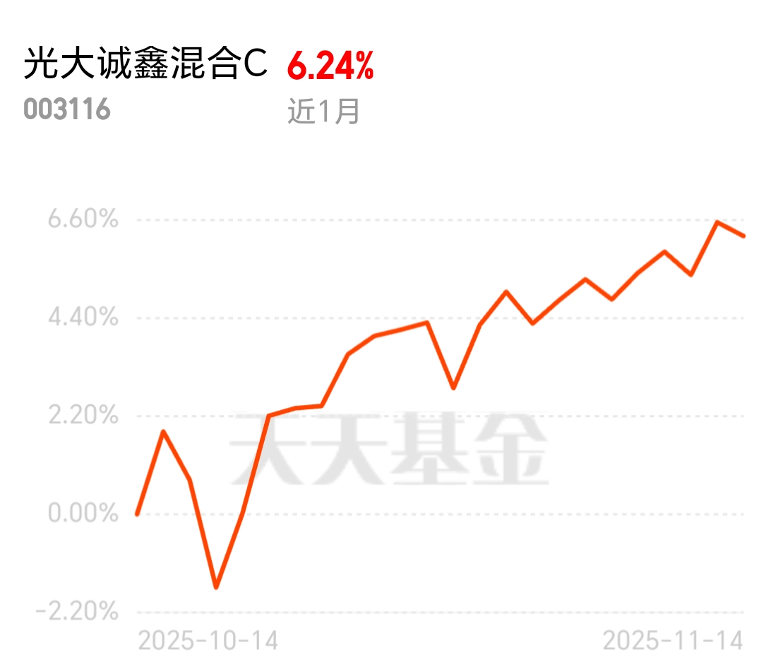近期私募和公募仓位都在回升,市场资金面挺活跃,但个股分化厉害,自己选股容易踩坑,光大诚鑫混合C近1个月涨6.24%,分散投资不集中,在震荡市抗跌又能涨,新手也能驾驭。