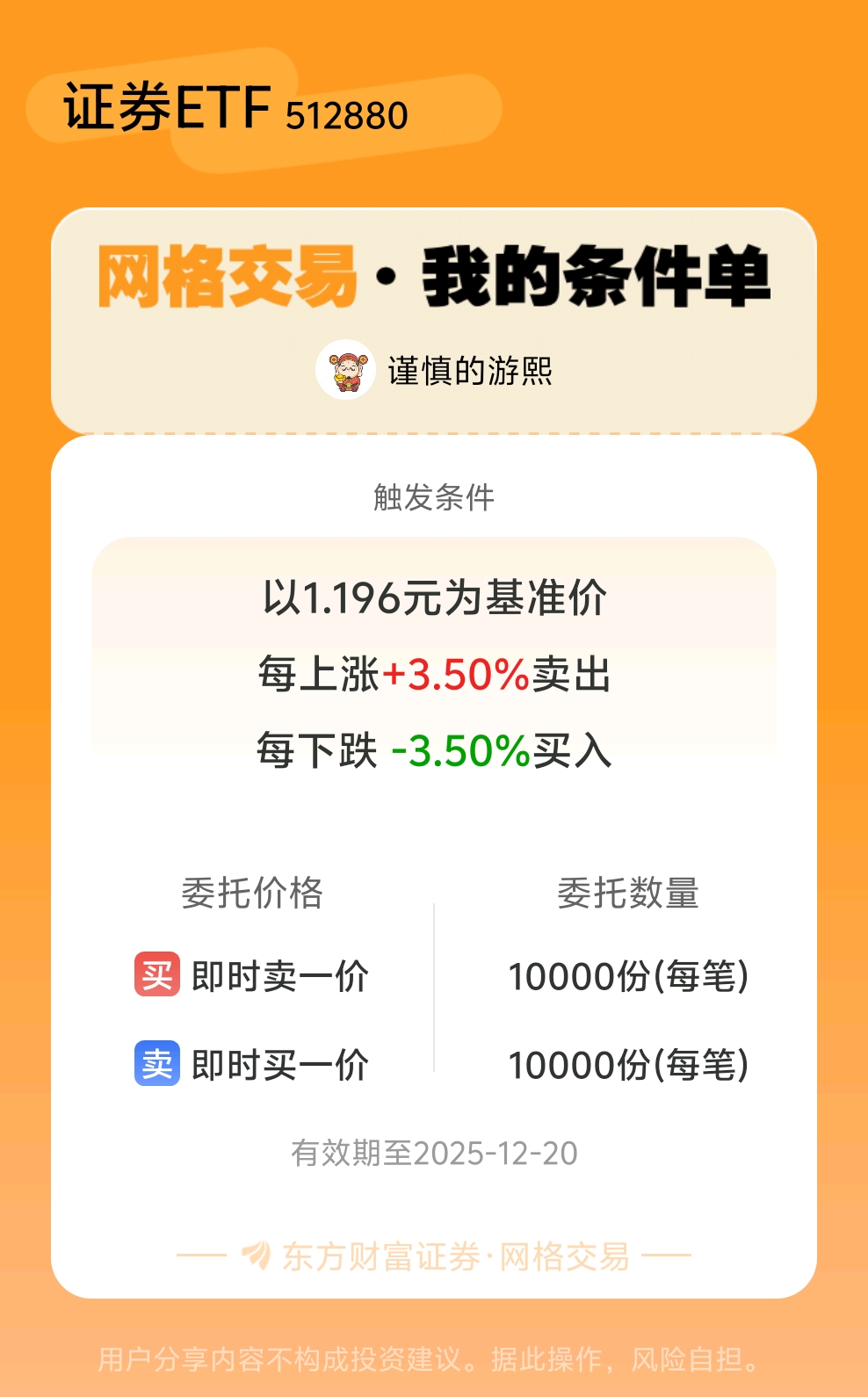 #条件单交流# #网格交易晒单# 一位股神设置了一个网格交易条件单,接下来就是见证奇迹的时刻~$证券ETF(SH512880)$