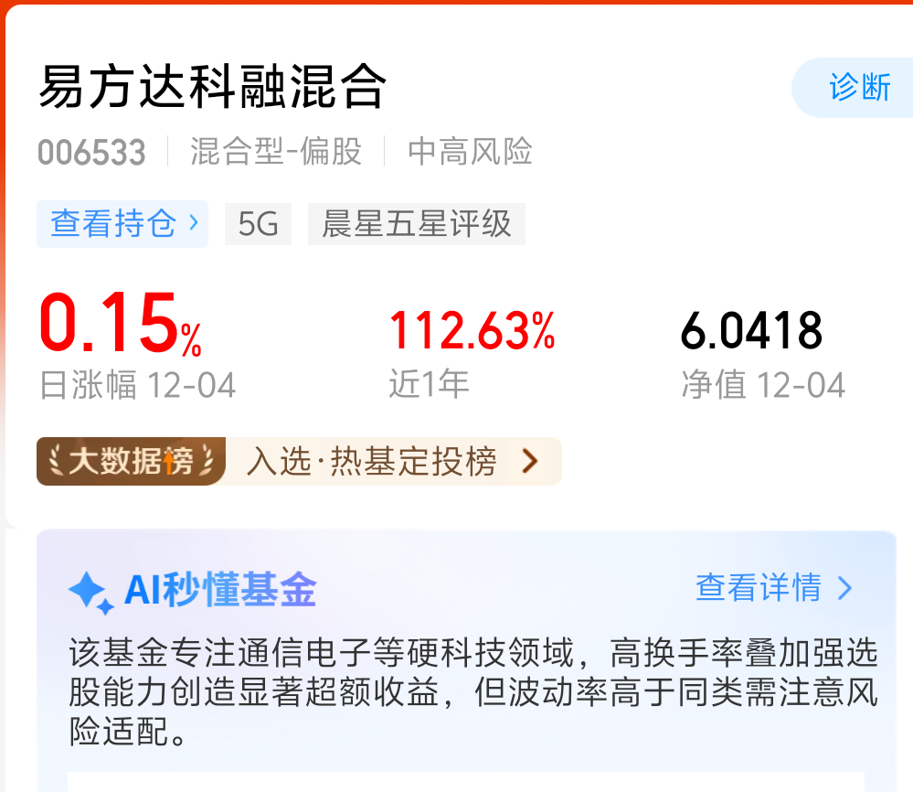 今日市场早盘探底回升,三大指数集体飘红,当前的市场行情还是轮动的比较快的,布局单一板块比较难跟上走势,像我持有的$易方达科融混合$ 006533就是布局A股+港股的科技、新能源、军工等多个方向成长混合基,近一年上涨了112.63%,它家的$易方达科讯混合$ 110029也是采用和科融一样的策略,但它是聚焦A股,我也一直关注中,长期看好!