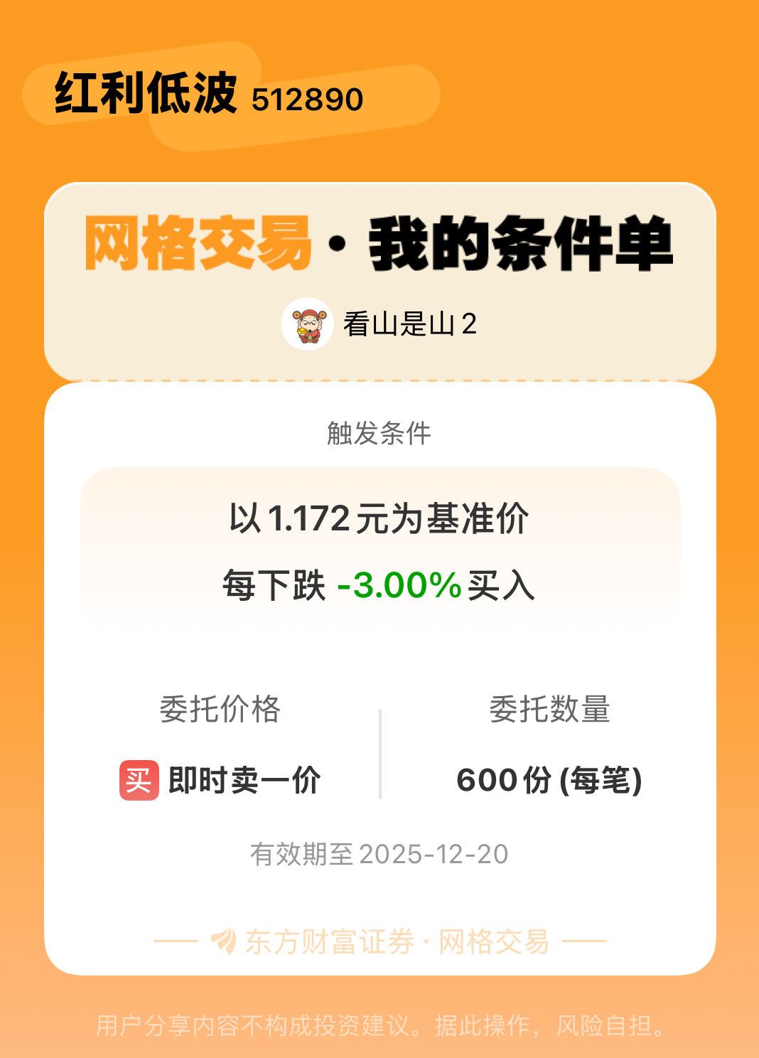 #条件单交流# #网格交易晒单# 一位股神设置了一个网格交易条件单,接下来就是见证奇迹的时刻~$红利低波(SH512890)$