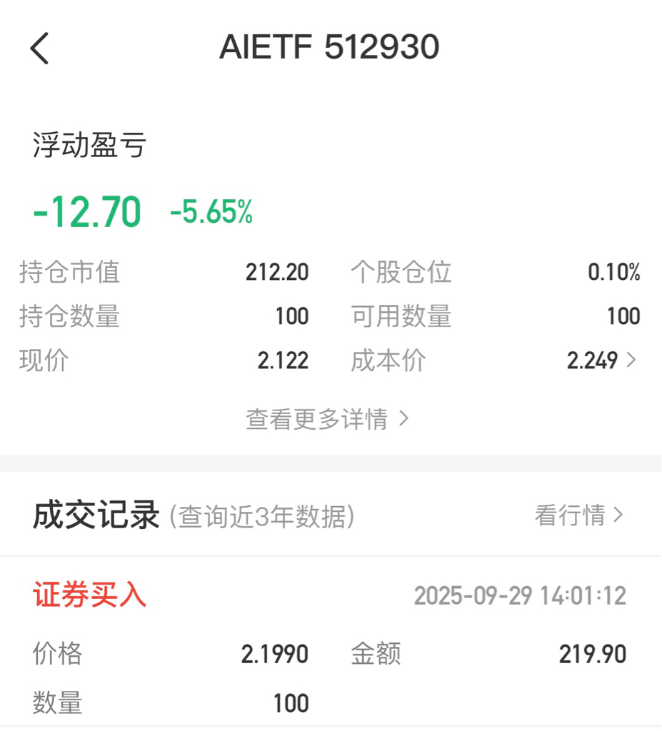 $AI人工智能ETF(SH512930)$ 我用我的实力,投资了一个月的稀饭钱为大家把AI的价格打下来