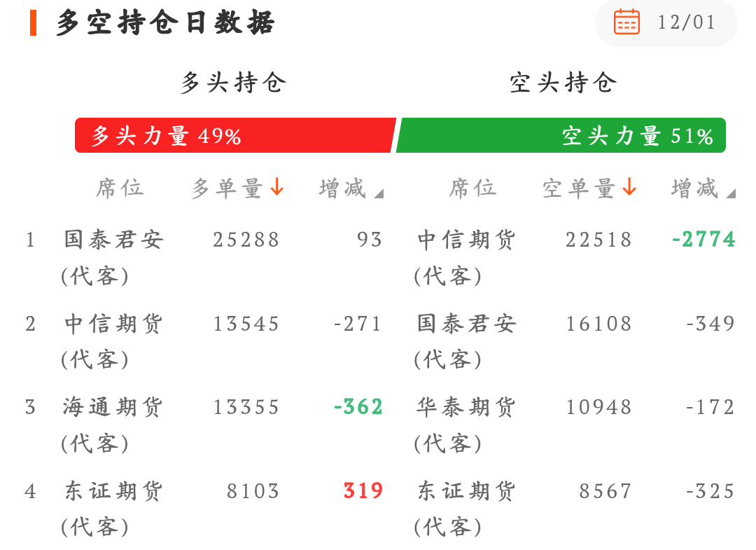从12月期的沪深300期指数据来看,中信席位的多头主力减持了多单271手,空头主力减持了空单2774手,对冲之后空单大幅减少2500多手,短期的压力大幅降低。
