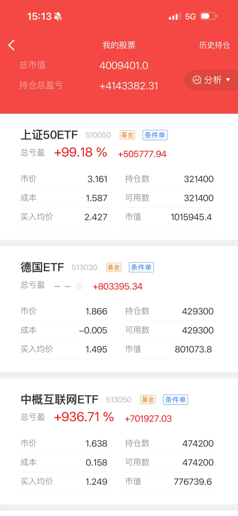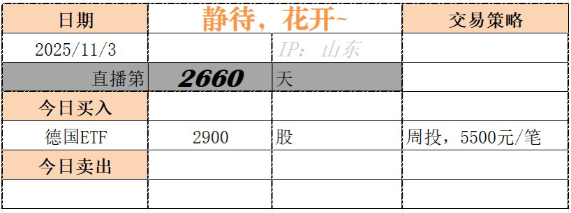 定投第2660天,今日买入德国ETF2900股,今日盈亏+444元,累计盈亏+414万元,静待花开~(实盘,原创,无小号)