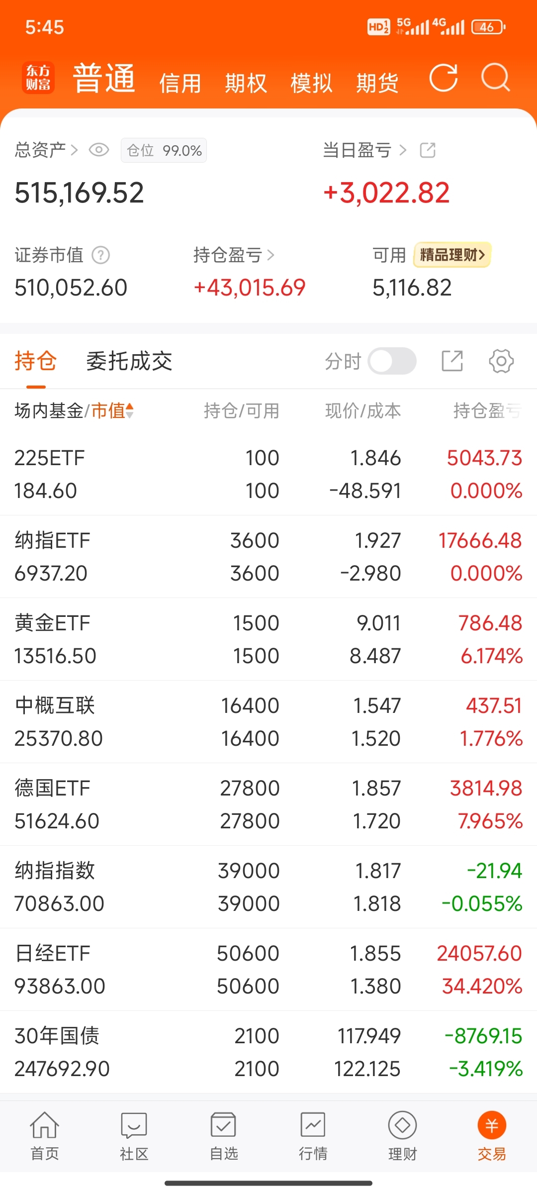 第222天,买入德国ETF800股,今日盈亏+3022,总盈亏+43015。..