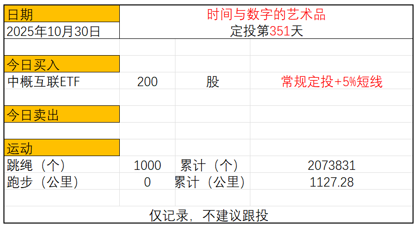 运动与投资第351天2025年10月30日今日定投:中概ETF买入200股跳绳: