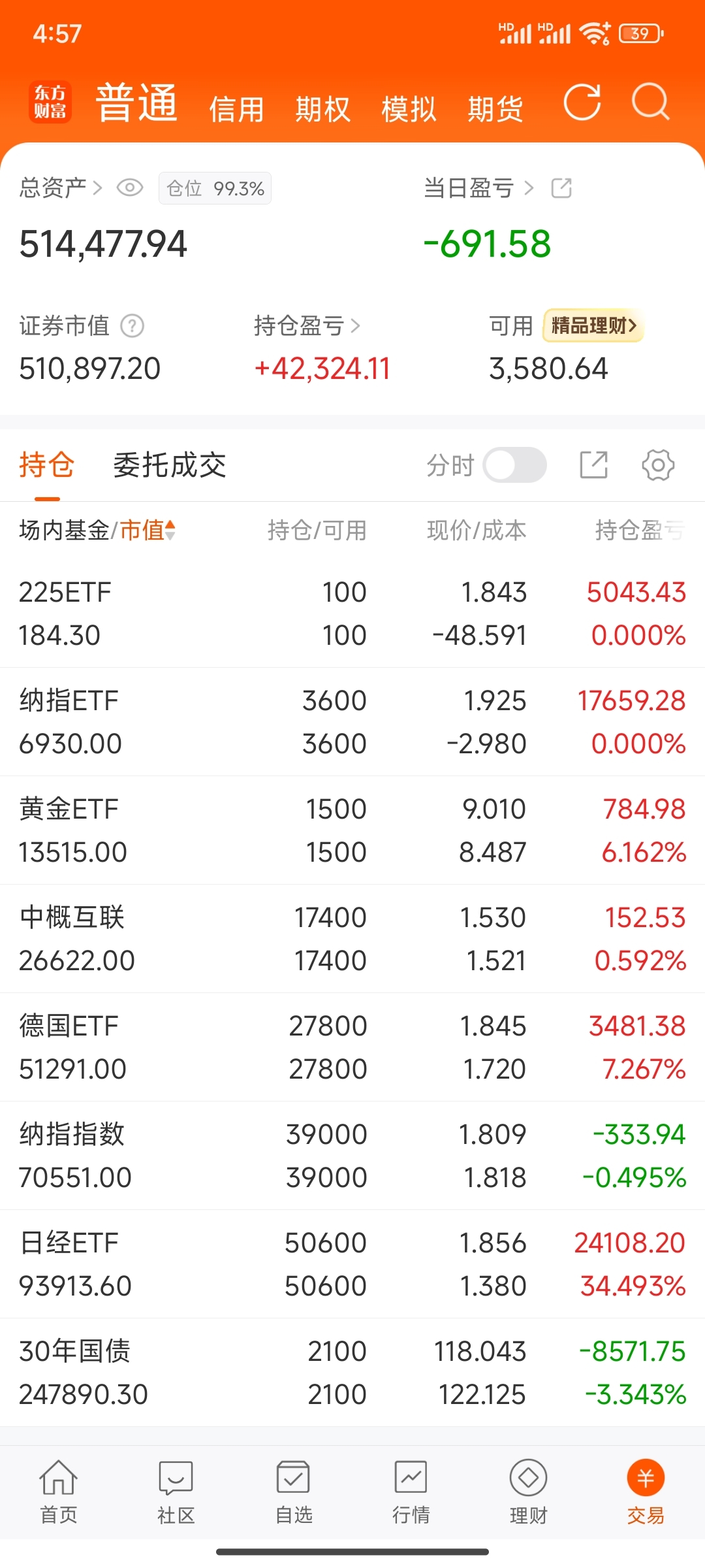 第223天,买入中概互联ETF1000股,今日盈亏-691,总盈亏+42324。