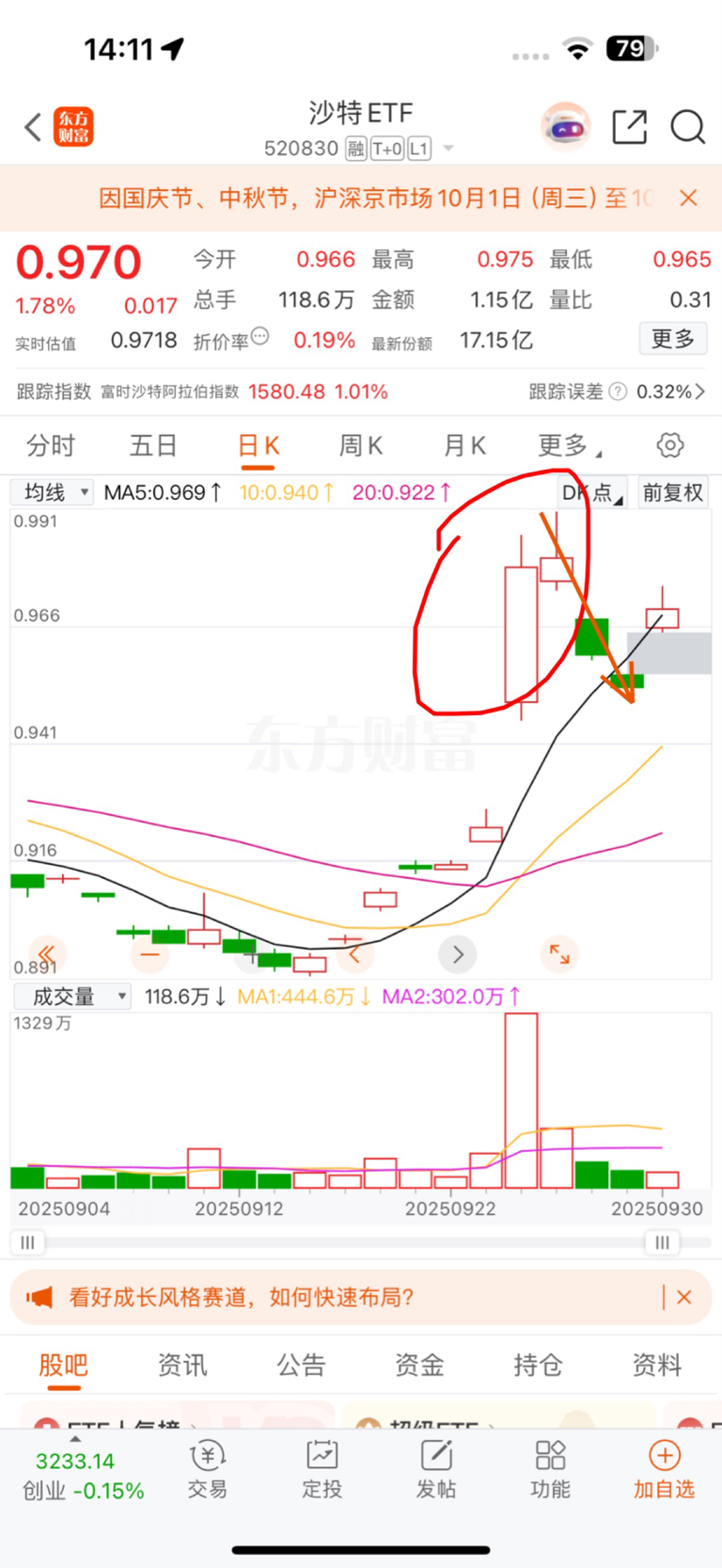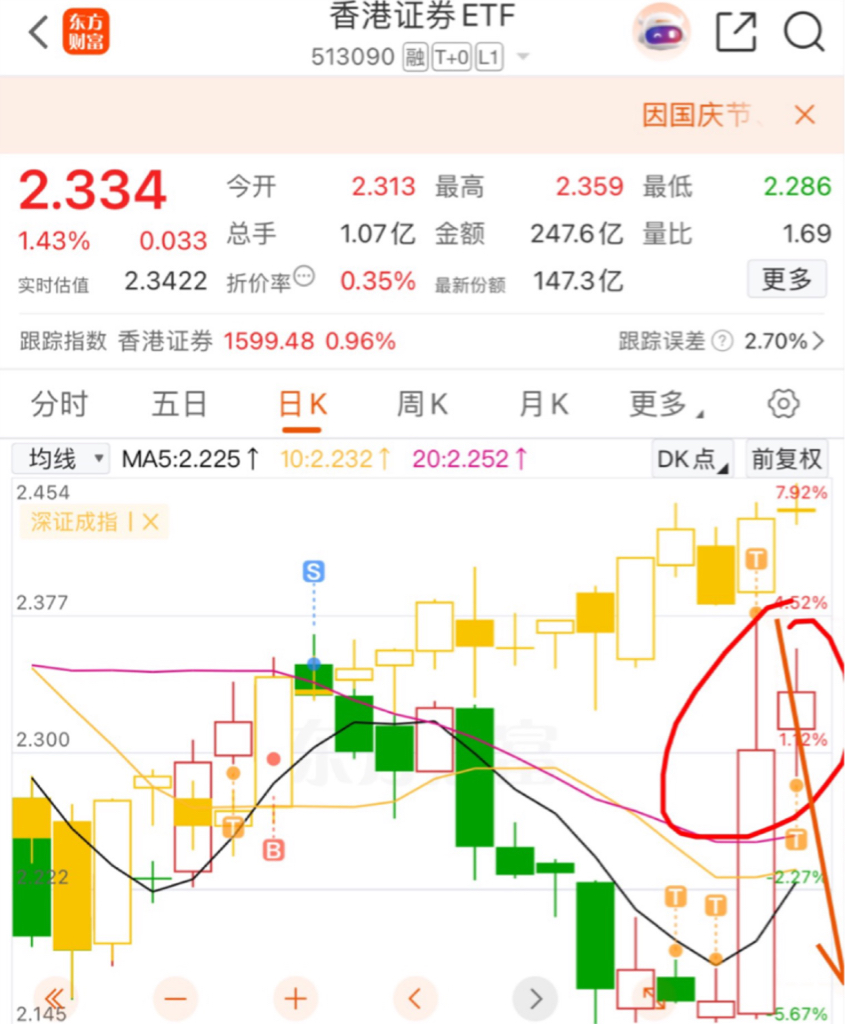 $香港证券ETF(SH513090)$ 盲目说港股国企涨的那批来看看现实吧、这只是第一天就绿了如果剩下七天假期出现什么阿美丽卡或者其他的利空新闻连跌七天呢? 有没有想过这玩意跟跌的时候大跌跟涨只会小涨,剩下七天没有利好就是利空,那就会变成沙特那只。节后一开盘 哦豁竞价9.15分-2% 9.30分开盘那一秒直接↓-5%哭都没地方哭,到时候就看谁更果断跑得快。