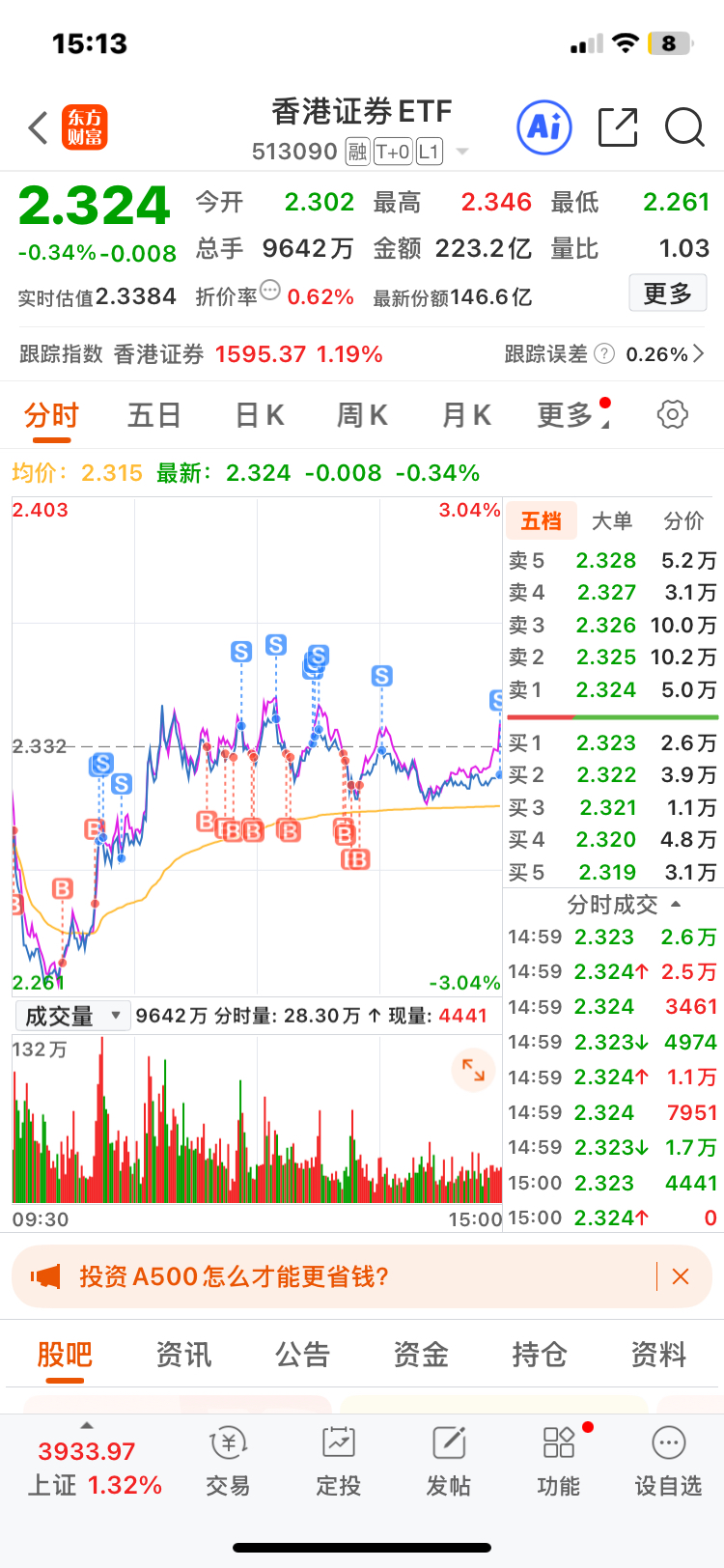 $香港证券ETF(SH513090)$ 早上那一下,整高了点