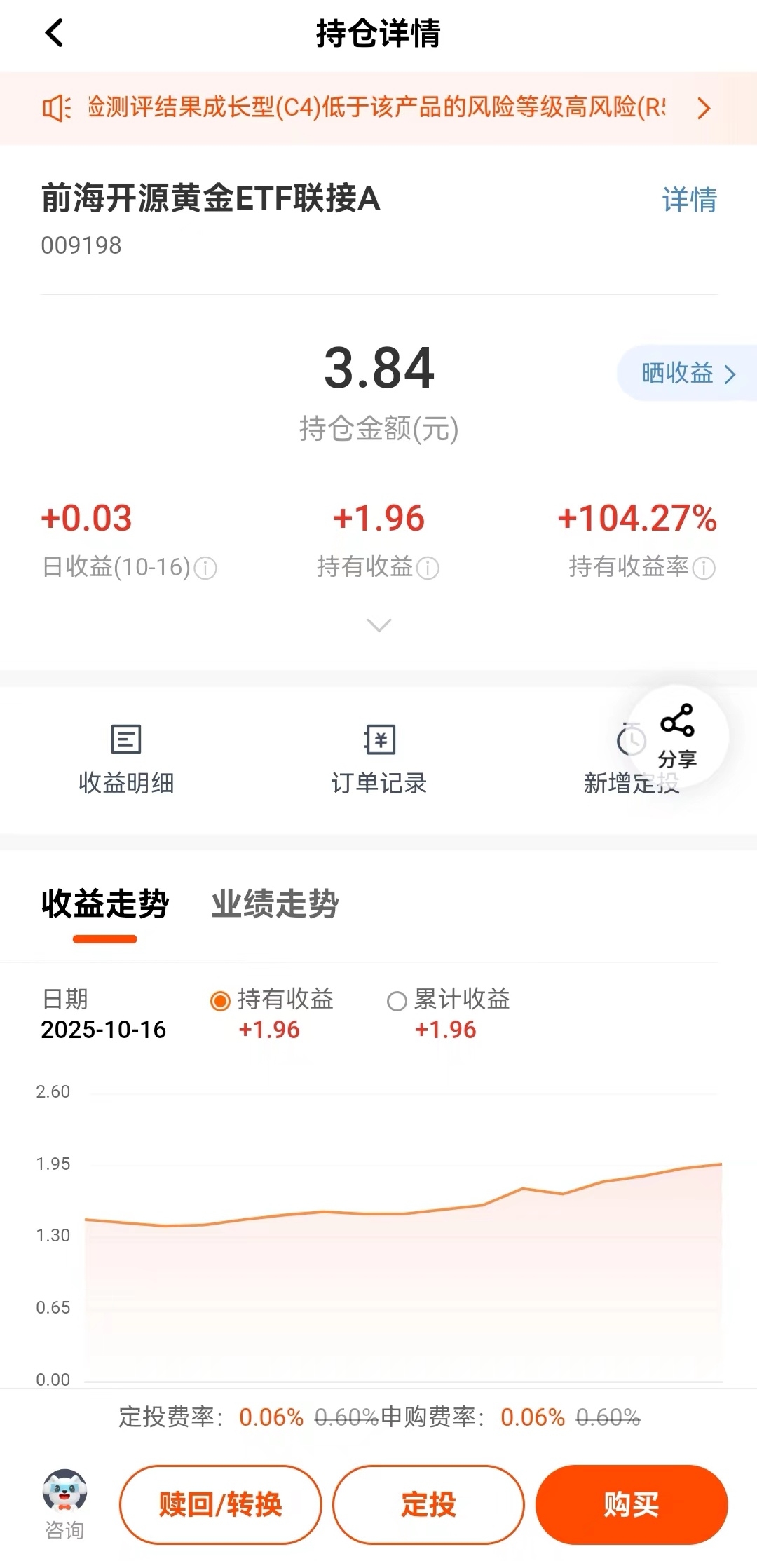 目前为止手里收率率最高基金,黄金曾经一度也滞涨,忍住没卖才能吃到大肉,大家要坚持
